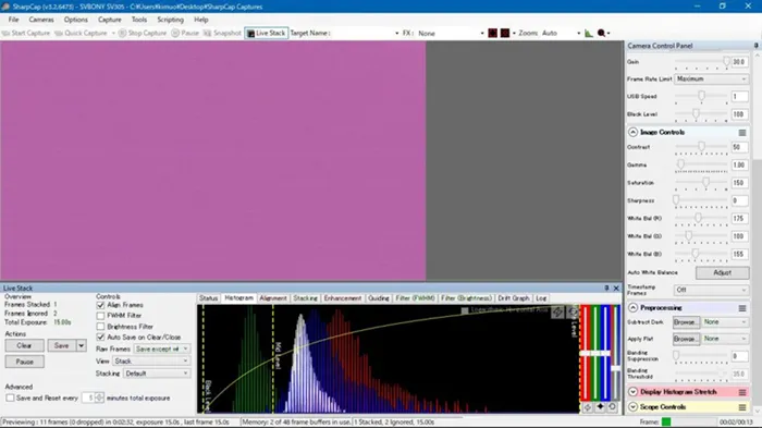 2.ドライバソフトをインストール後、Shrapcapが正常に立ち上がったら、右上のCamerasタブをクリックすると「SVBONY SV305」が表示されるの選択します。カメラが認識されると右側に操作ウインドウが開きます。主に調整するのは「Exposure」(シャッタースピード)と「Gain」(ゲイン)です。レンズ(望遠鏡)のF値にもよりますが月以外はシャッタースピードは最低でも1秒以上、ゲインは高めにしないと、ピントが大きくずれている場合視野に入っているかどうかさえ分かりません。