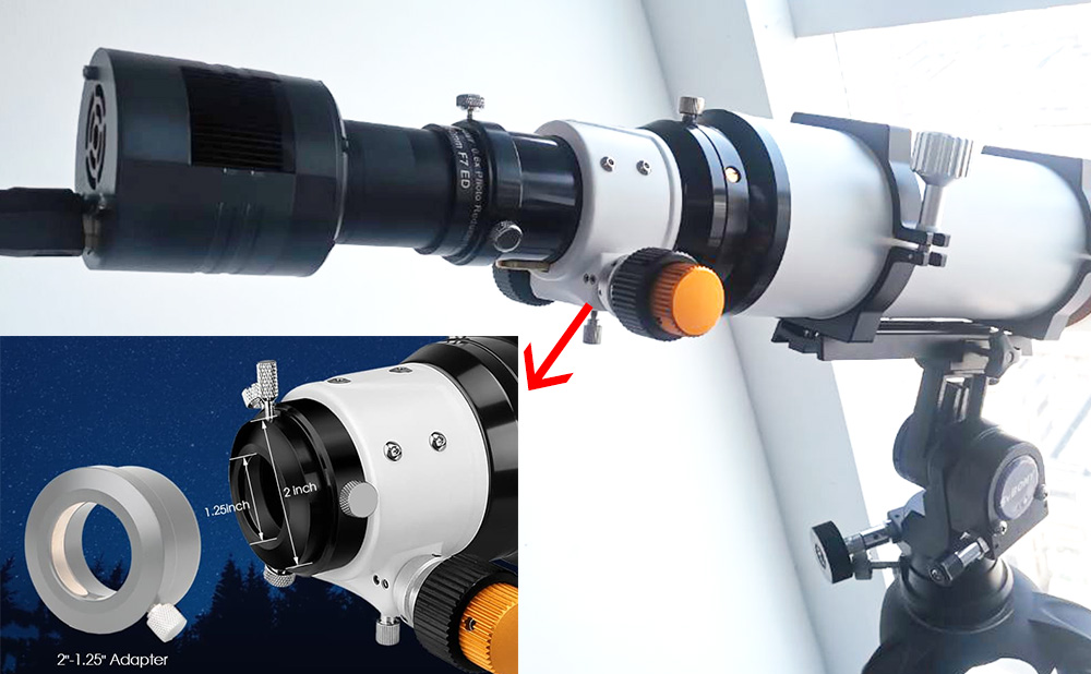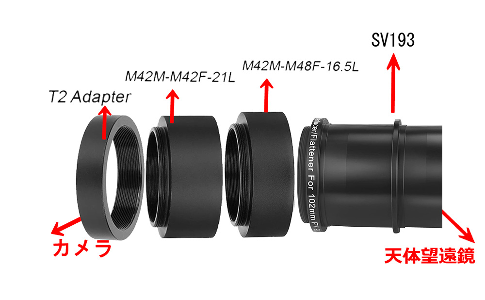まず、鏡筒のネジを緩め、SV503 102mm天体望遠鏡に付属の1.25インチアダプターリングを取り外します。そして、SV605CCカメラを組み立て、3つのアダプターリングT2 Adapter、M42M-M42F-21LとM42M-M48F-16.5Lを取り出します。T2 アダプターリングSV605CCカメラにねじ込み、次に21mmアダプターリングT2 アダプターリングにねじ込み、そして16.5mmアダプターリングを21mmアダプターリングにねじ込みます。そのあと、SV193 0.8X フラットナーを 16.5mm アダプターリングにねじ込みます。最後に組み立てたSV605CCとSV193の機材を鏡筒に差し込み、鏡筒本体のネジを締めます。