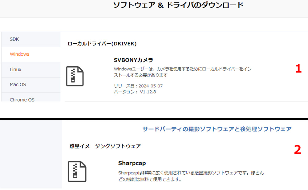 日本SVBONY公式Webサイトでのジャンプリンクからソフトウェアをダウンロードすることをお勧めします。ここではSV905CCMOSカメラを例にとると、ちょっと説明いたします。ダウンロードリンクは:https://www.svbony.jp/downloads