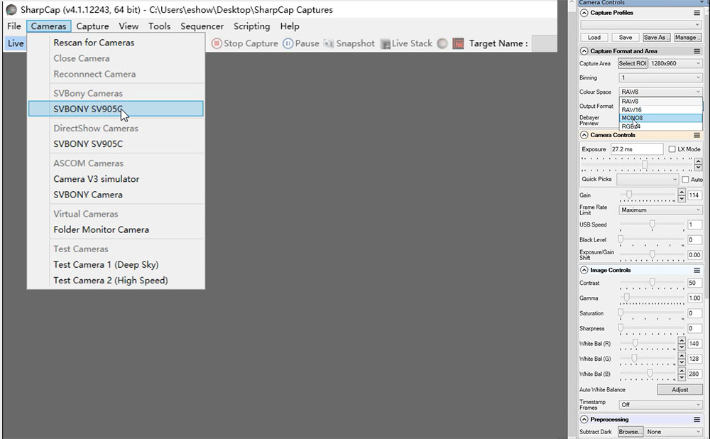Sharpcap ソフトウェアをクリックし、認識されたカメラを選択し、SVBONYカメラを実行するSVBONYカメラドライバーを選択します。このとき、画面が真っ白または真っ黒になってしまう場合がありますが、カメラやソフトウェアの問題ではございませんのでご了承ください。