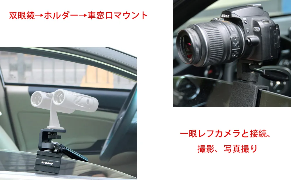 ただ車窓マウントを車の窓に固定して、双眼鏡、フィールドスコープ、カメラで自由に外の大自然を鑑賞できます。