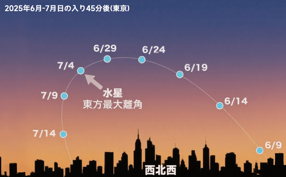2025年7月4日、夕方の水星が太陽から最も離れる「東方最大離角」となります。日の入り45分後の高度は約8度と低いですが、夕方に見える水星としては今年最も高い、比較的好条件です。