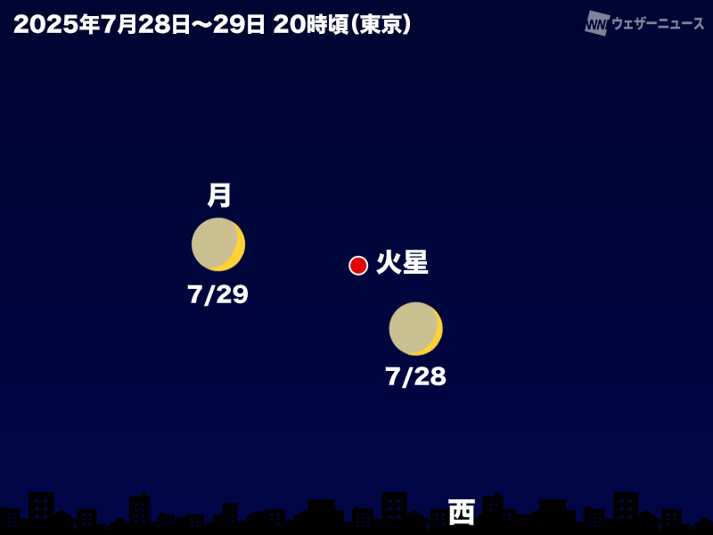 7月28日(月)の宵には細い月が火星に接近します。西方の低空で見られるため、開けた場所からお楽しみください。