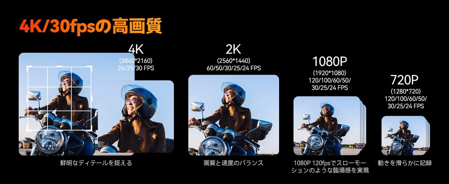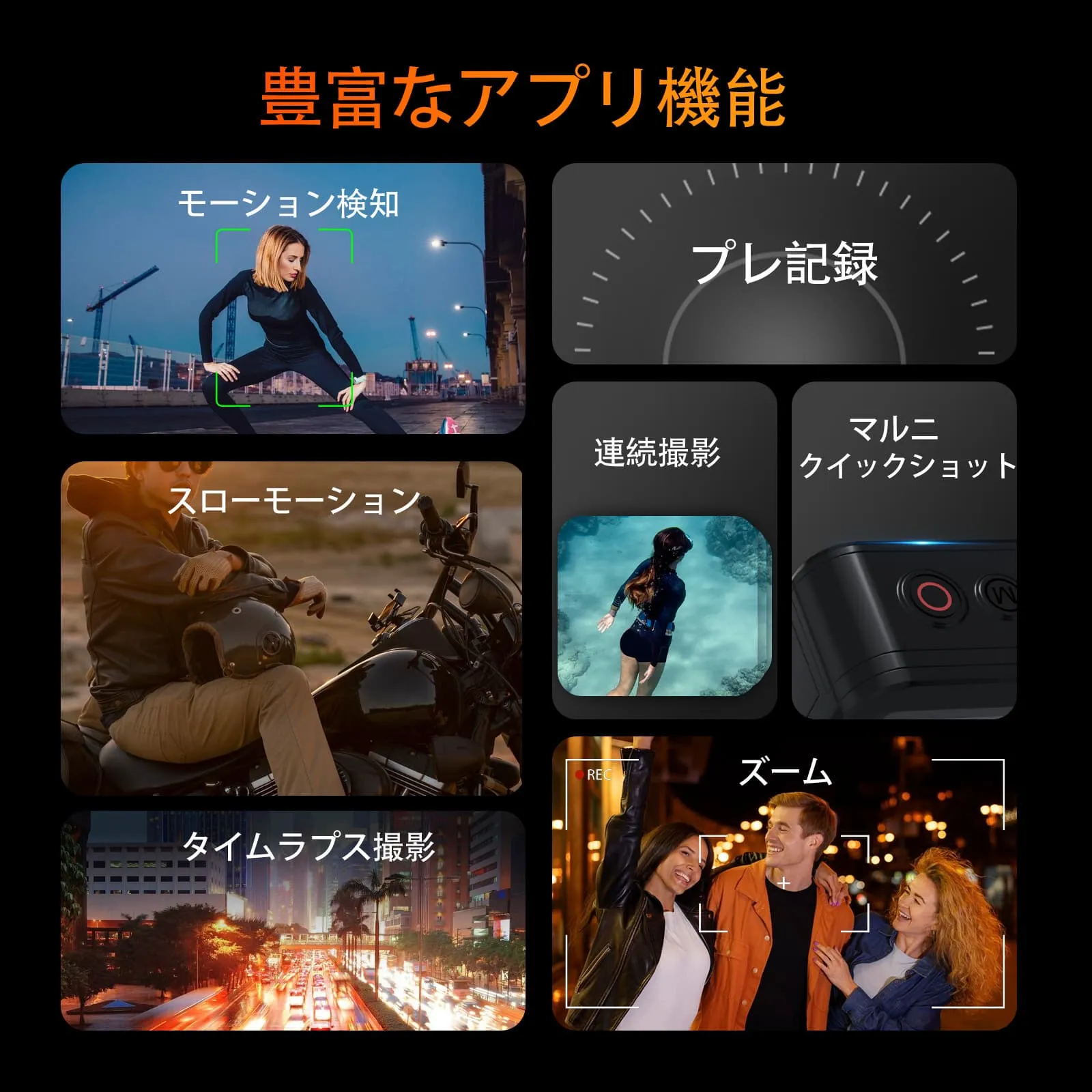 ・多彩なアプリ機能。クイック録画、ループ録画、プレ録画、アフレコ、タイムラプス、スローモーション、ビデオ/写真モード、カーモード、ダイビングモードなど、それぞれの機能は、どんなシーンでも人生のあらゆる瞬間を完璧に捉えられるように設計されています。