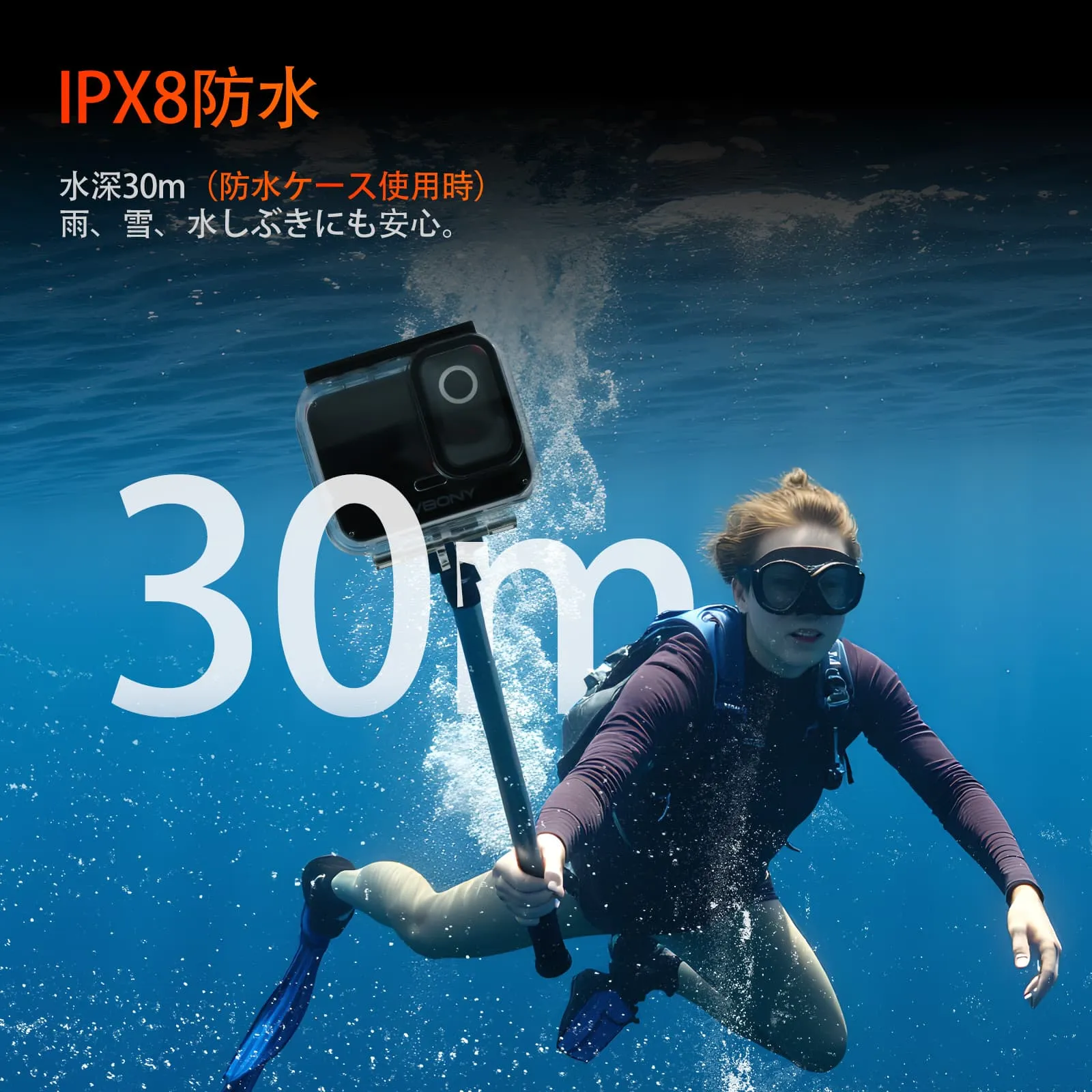 ・30メートル防水(防水ケースを使用する)。防水ケースに入れないと防水ではありません。このアクションカメラはIPX8定格で、最大30メートルまで潜ることができます。水中の撮影や、雨や雪の中でも使用できます。
