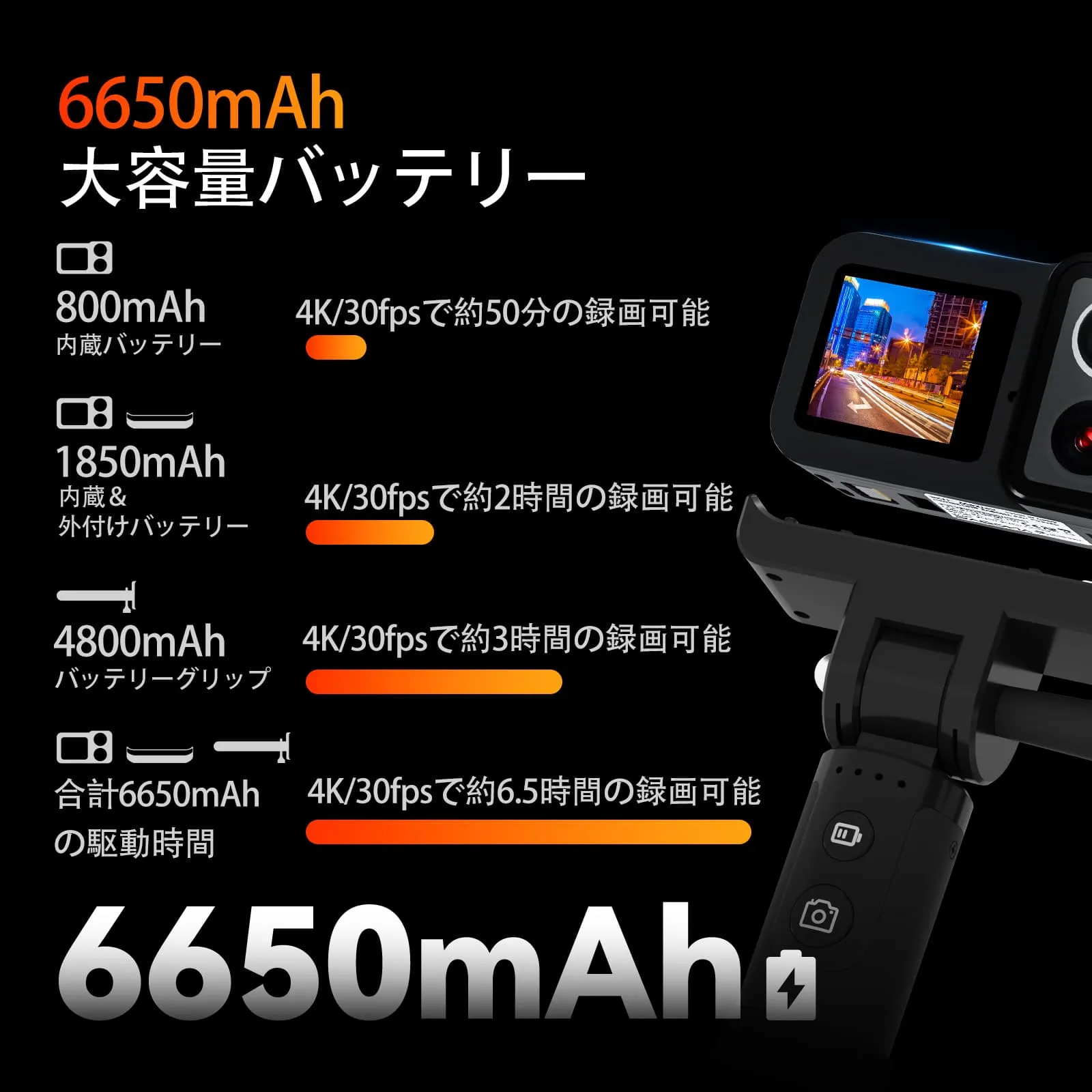 ・超長連続撮影。高性能800mAhバッテリーを内蔵し、外付け1050mAhバッテリーと充電式4800mAhカメラハンドルを組み合わせることで、充電せずに最大6.5時間撮影できます。
