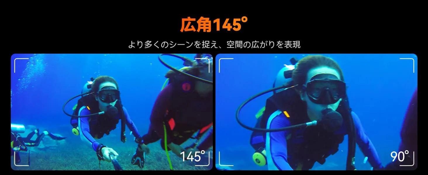 ・145°広角。145°の広角を持つUHD 4Kアクションカメラは、非常に広い範囲を視野に収めることができます。広大な風景や、限られた空間内での被写体を、より多く、よりダイナミックに撮影できます