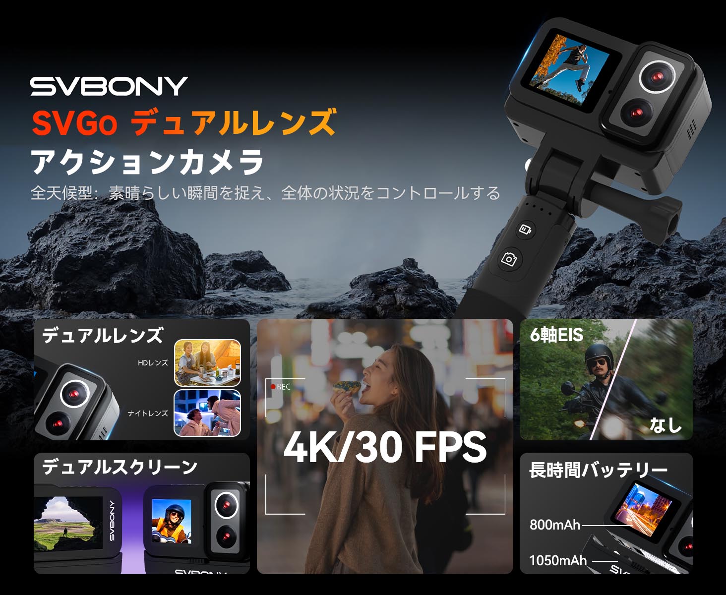 SVBONY SVGoデュアルレンズアクションカメラはデイレンズ・ナイトレンズを切り替えることで昼でも夜でも最適な映像を撮影することができます。 究極のパフォーマンスと汎用性を備え、冒険家やコンテンツクリエイターにとって、革新的なスポーツカメラです。内蔵バッテリー、外付けバッテリー、充電式カメラグリップを備え、充電せずに最大 6.5 時間撮影できます。