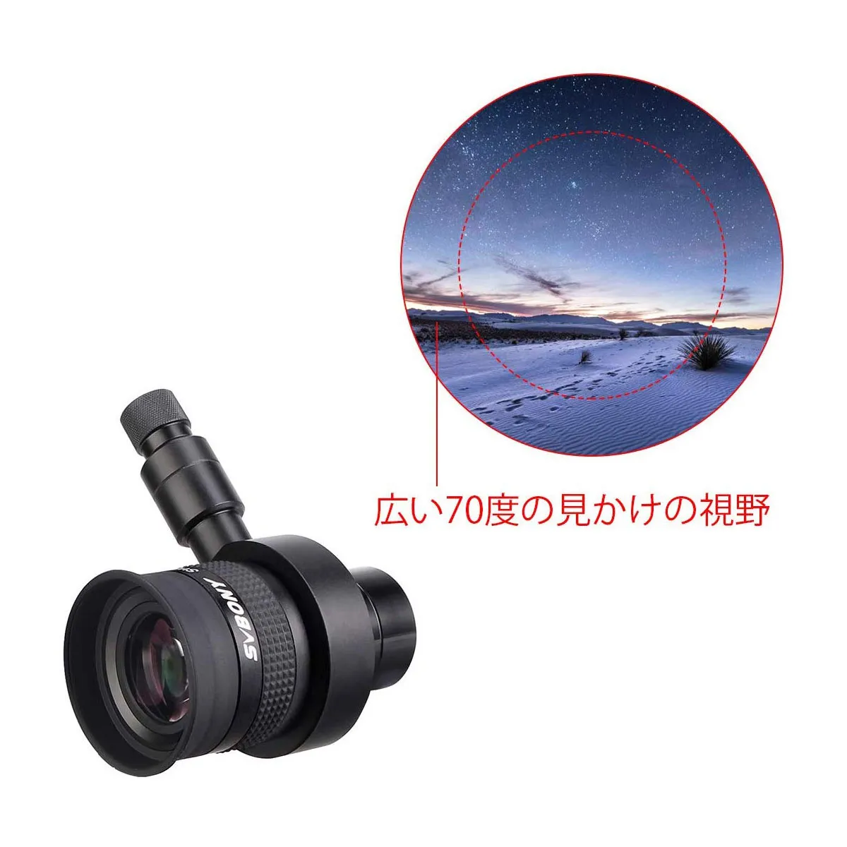70度の広い視野により、短焦点距離のアイピースよりも簡単にオブジェクトとアライメント星を見つけることができます。
