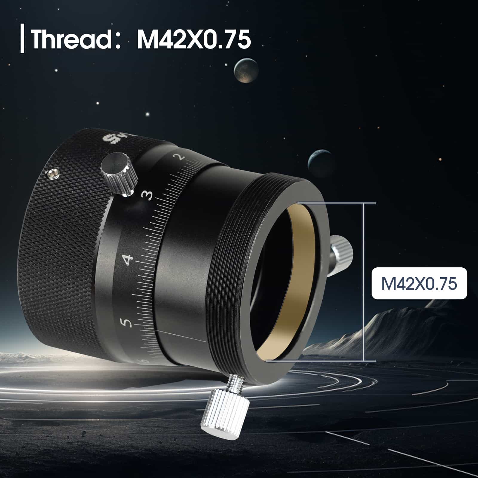 シュミカセでイライラするのがミラーシフト。 焦点調整の度に視野の対象物が移動してしまいます。 手元で焦点の微調整ができるこのグッズはとても便利です。 目盛当たり0.1mmの微調節ができます。 コネクタ部は42mm径のアタッチメントが適合します。 内径は31.7mmでアメリカンサイズの標準アイピースに適合。 金色のネジで焦点を固定できます。 外径には42mmネジ山が切ってあり、 アイピース固定用のネジを取ればカメラ用のTリングが取り付けられます。 ライブビューで倍拡大すればピント出しが快適。