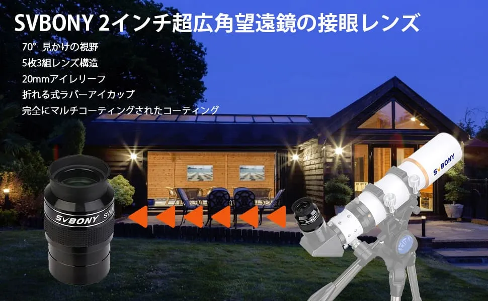 - 1、SVBONY 26mmの超広角2インチ接眼レンズは、優れた観察体験をもたらします。超広角70度の見かけの視野は、忘れられない空間感覚を提供します