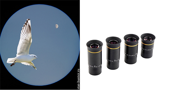 ほぼ等しい焦点距離のアイピースの場合、見掛け視野の広いアイピースの方が 実視野は広くなります。見掛け視野の広いアイピースの方が、 より素晴らしい「スペースウォーク」を体験出来ます。