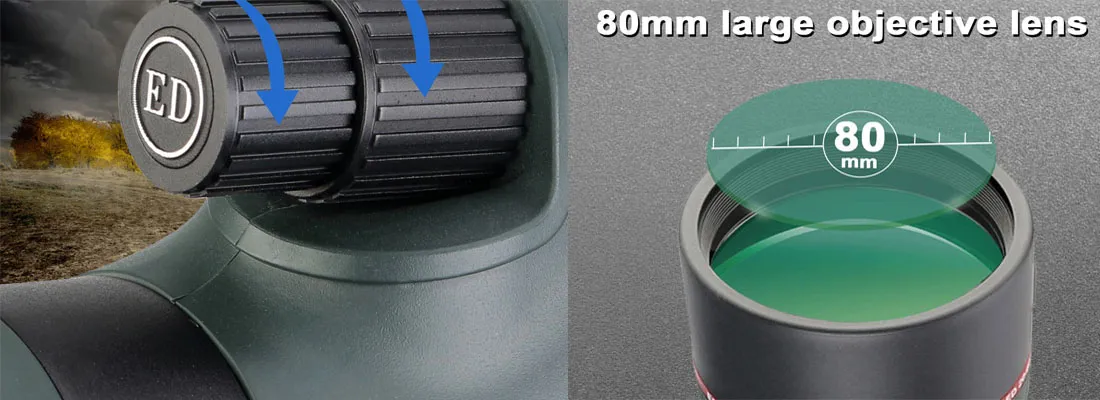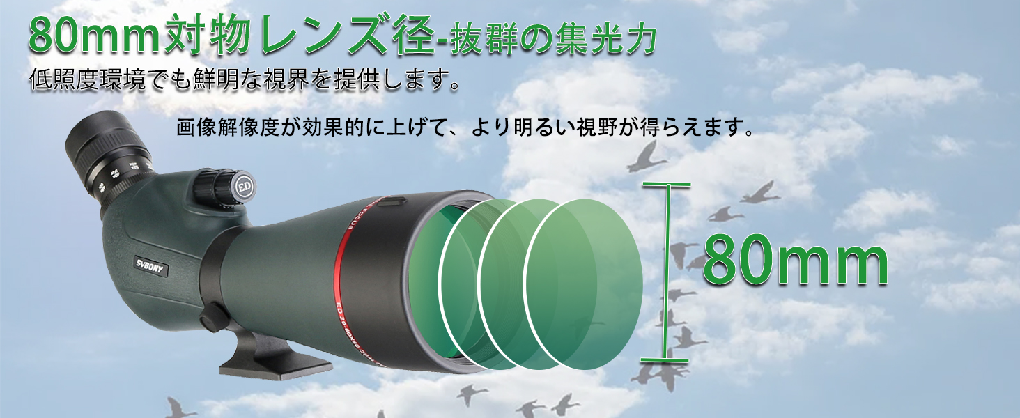 対物レンズの直径は80mmで、マルチコーティングされたBAK4プリズムを採用し、コントラストが高く鮮明に見ることができます。