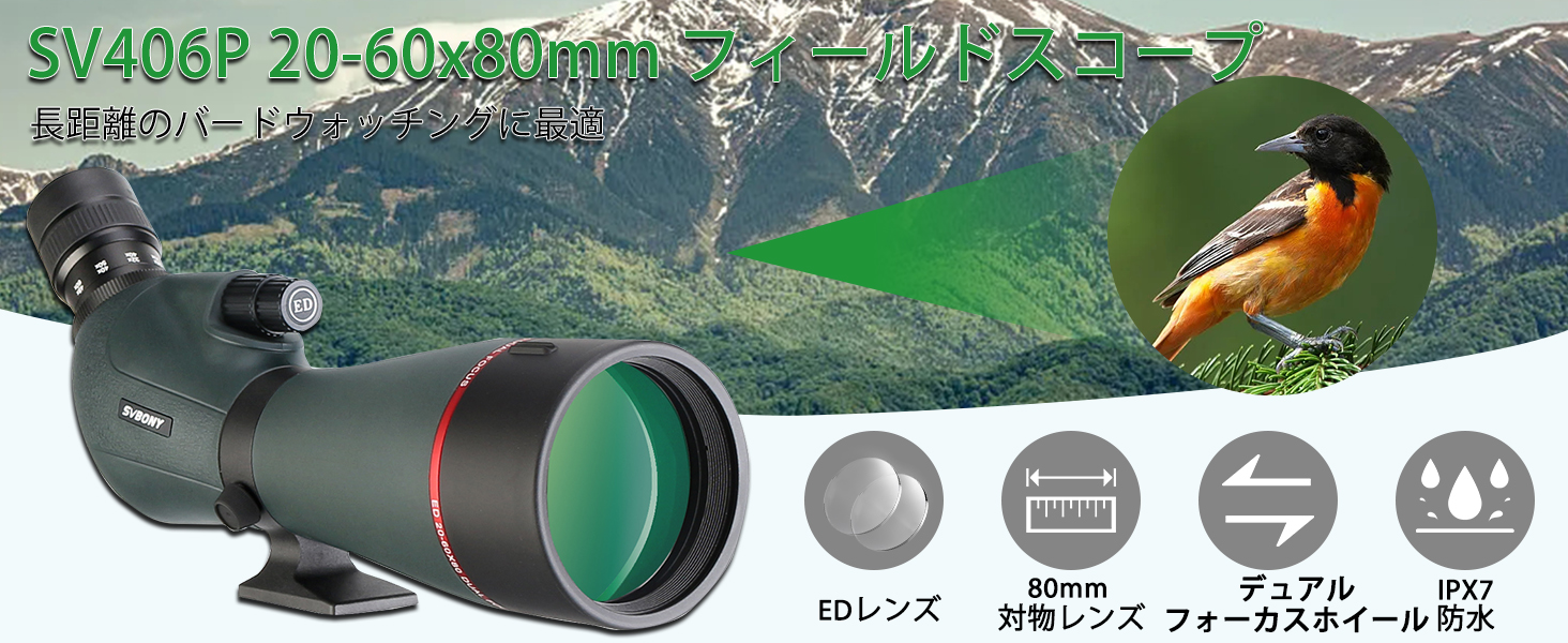 SV406P フィールドスコープは、20倍から60倍の強力なズーム倍率と高品質の光学システムを備えています。さまざまな観察ニーズに対応します。幅広いED光学ズームビジョンを提供するだけでなく、防水性が高く、操作が簡単です。野鳥観察、ターゲット射撃、アーチェリー、ハンティング、バードウォッチング、野生生物ウォッチング、ハイキング、キャンプ、風景、屋外スポーツ、天文観測などに最適です。