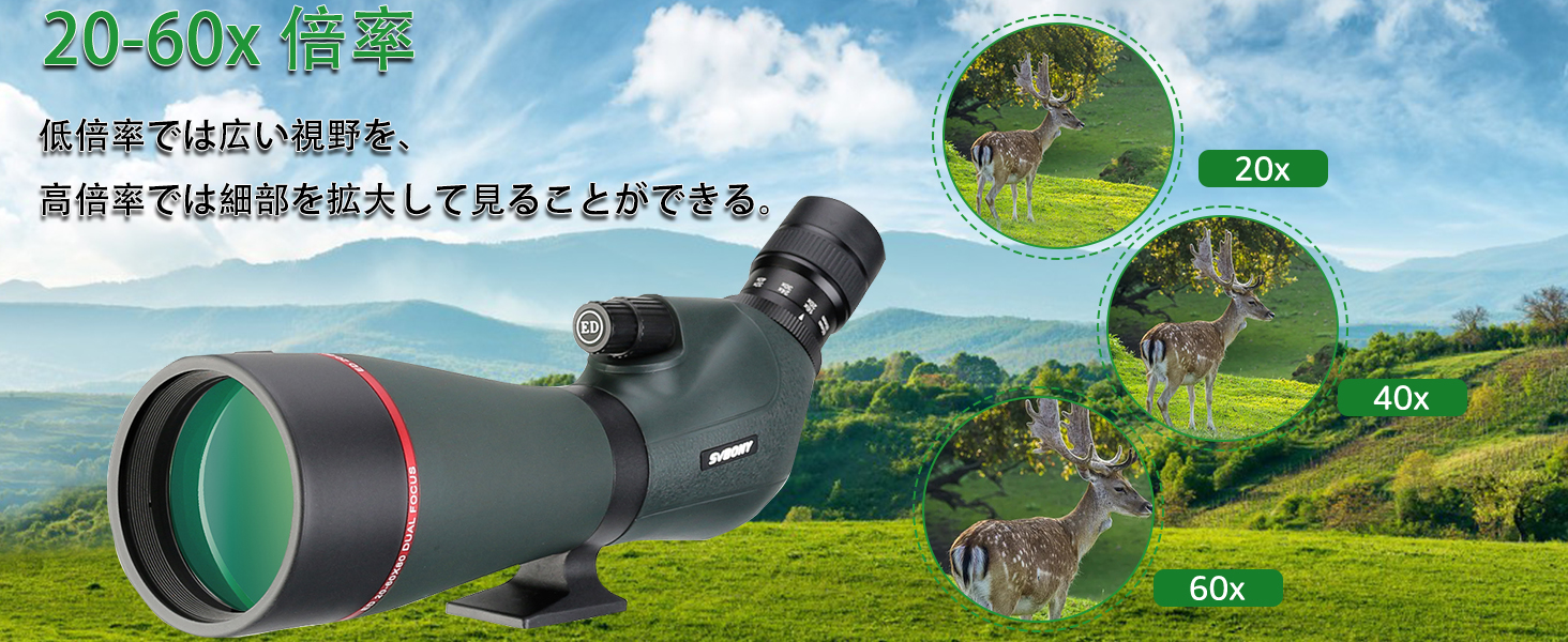 使用範囲:野生動物や野鳥の観察、天体観察、アーチェリーや射撃の標的確認など幅広く利用できます。