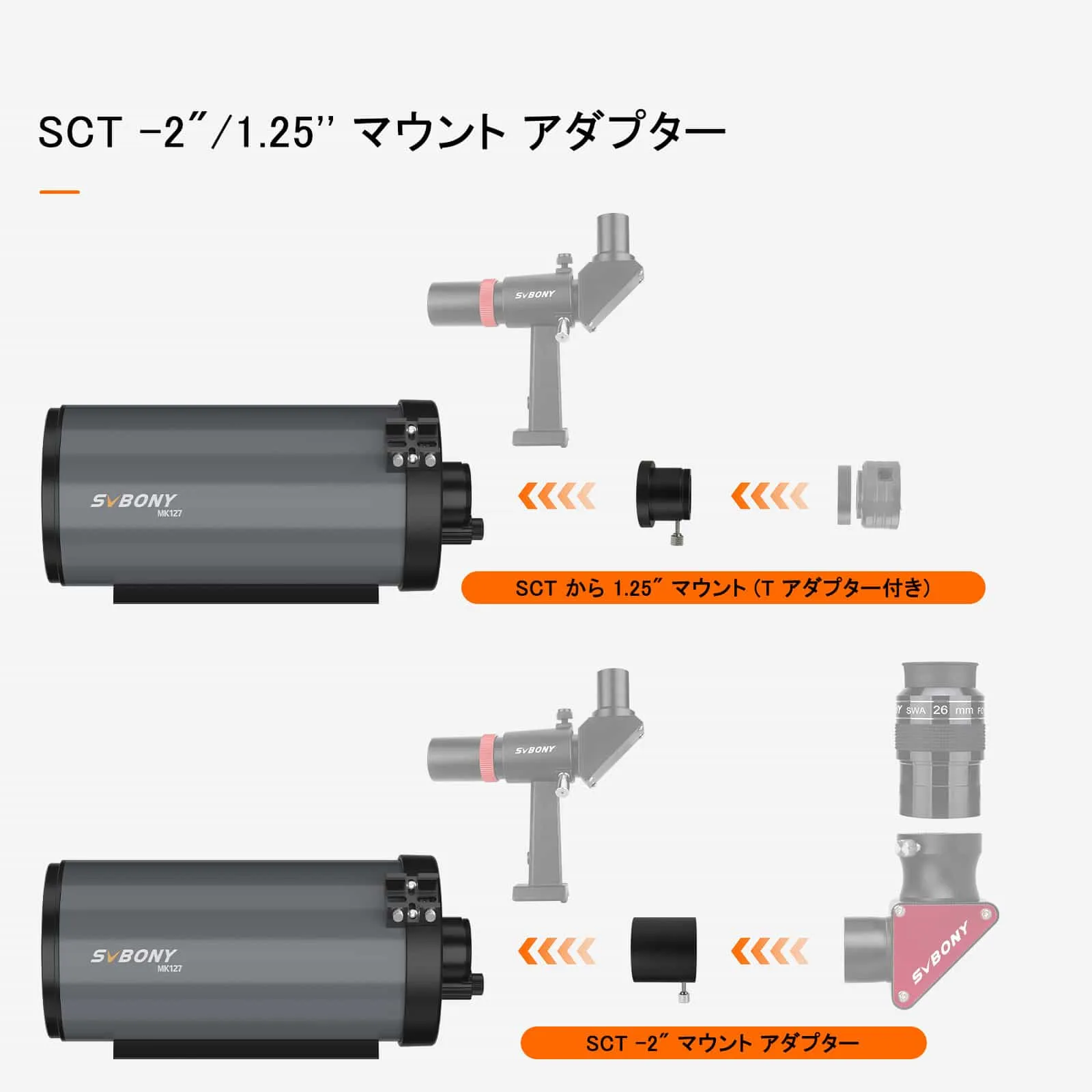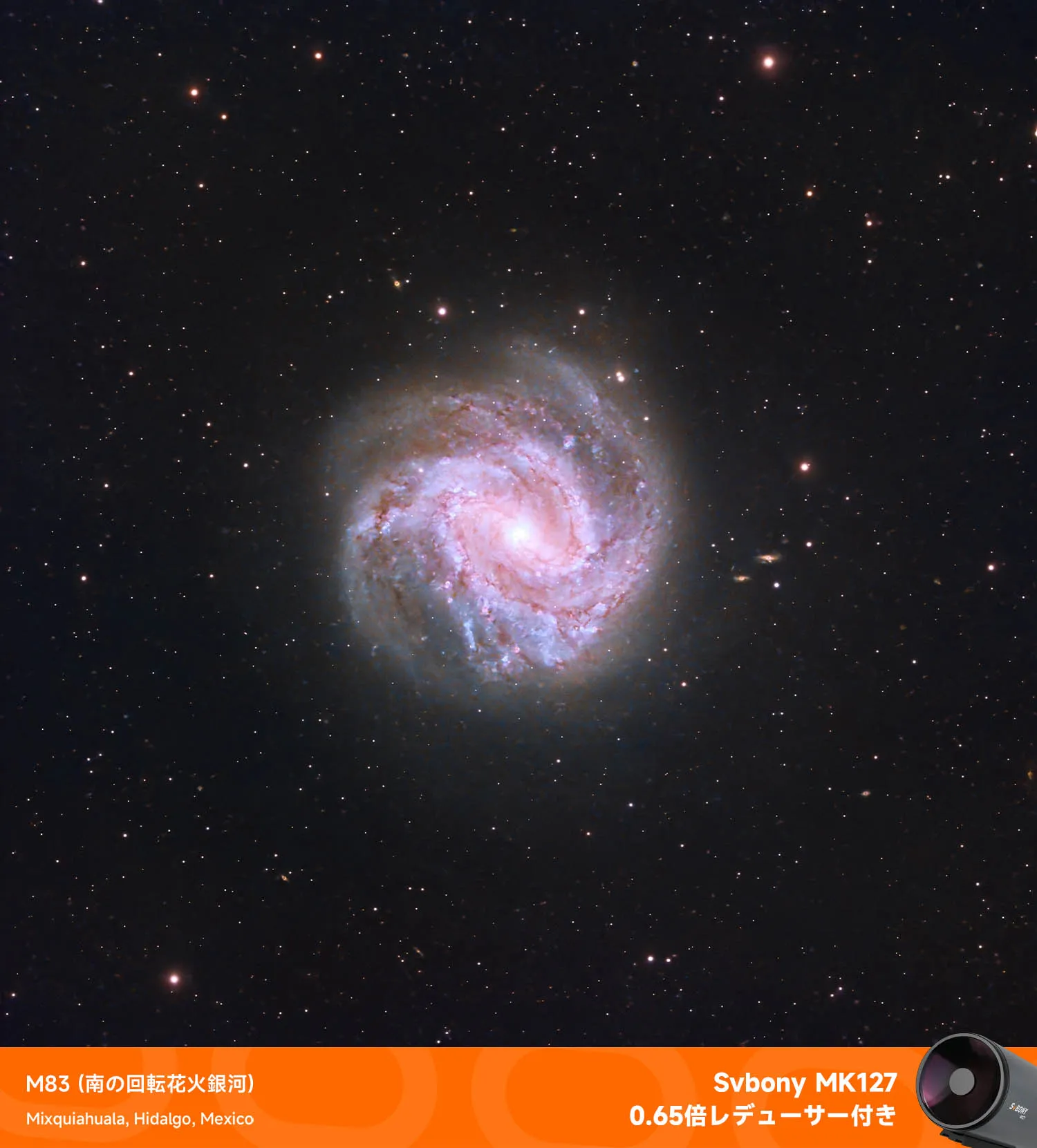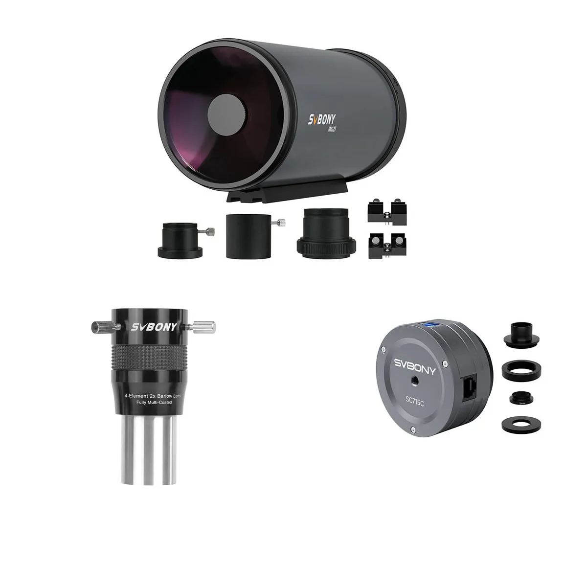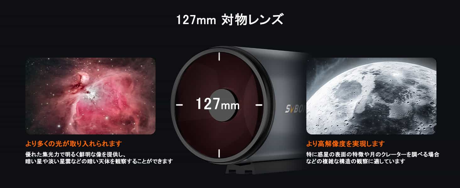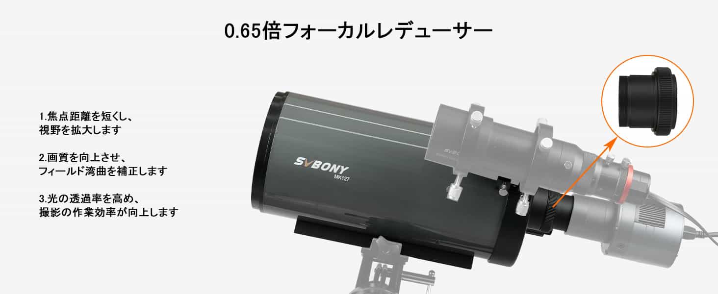 Svbony MK127 マクストフカセグレン OTA は、メニスカス レンズ、主鏡、および独立した副鏡で構成されるルマック・カセグレン式天体望遠鏡です。有効口径 127mm、焦点比 11.8 、0.65 倍のレデューサーで 7.68 まで縮小できます。 独立した副鏡の設計により収差をよりよく補正することで、非常にシャープな像を得ることが可能です。また、副鏡は誘電高反射率コーティングを採用し、副鏡の反射率を向上させています。