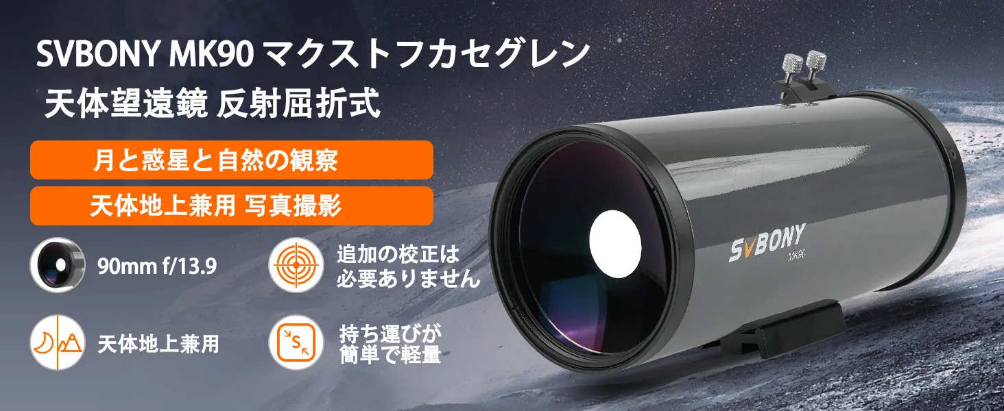 4 | ReviewsSVBONY MK90 天体望遠鏡高精度メニスカスレンズを採用したマクストフカセグレン式望遠鏡です。口径90mm、F13.9の高精度マクストフカセグレン天体望遠鏡です。重量1380g、軽くて架台への負担が少なく、収納性にも優れます。 月や惑星の観望に威力を発揮します。