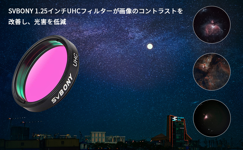 UHC---ultra high contrast(ウルトラハイコントラスト) と名づけられている通り、空の背景の暗さを高め、ガス星雲のコントラストもはっきりわかるほど向上させます。