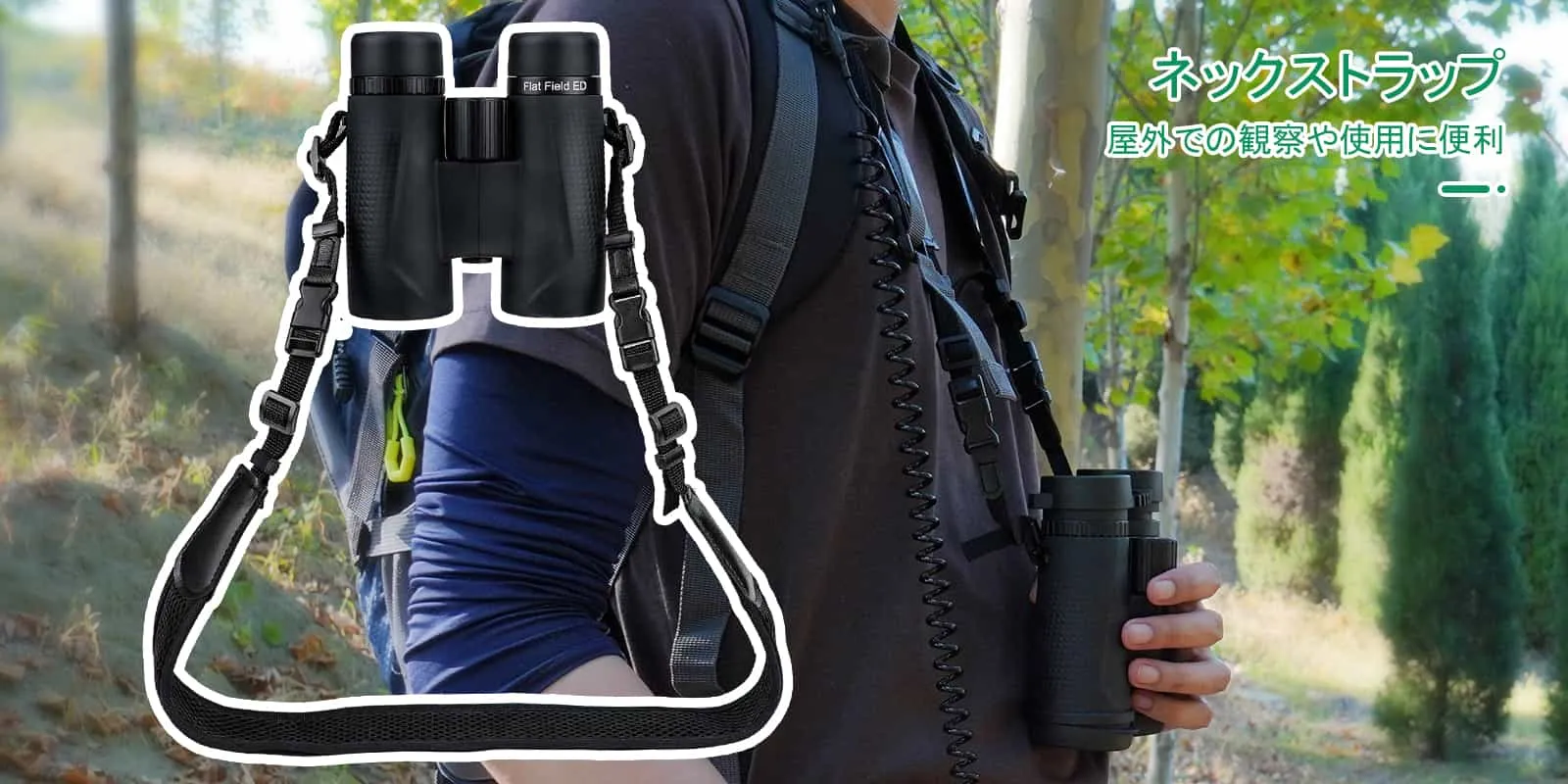 付属のネックストラップで負担なく首からかけられます。屋外の風景観察、動物観察、旅行などに非常に適しています。