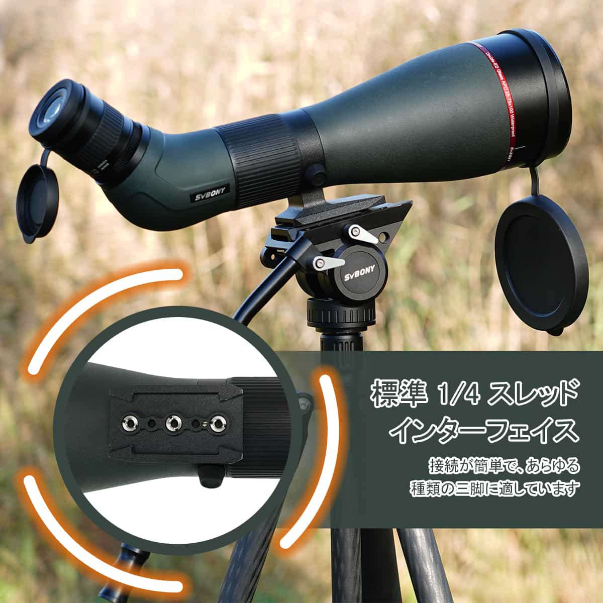 1/4三脚ネジインターフェースはスポッティングスコープの底部に組み込まれています。 カメラの三脚に接続できます。 市場で販売されているほとんどの三脚に適合します。