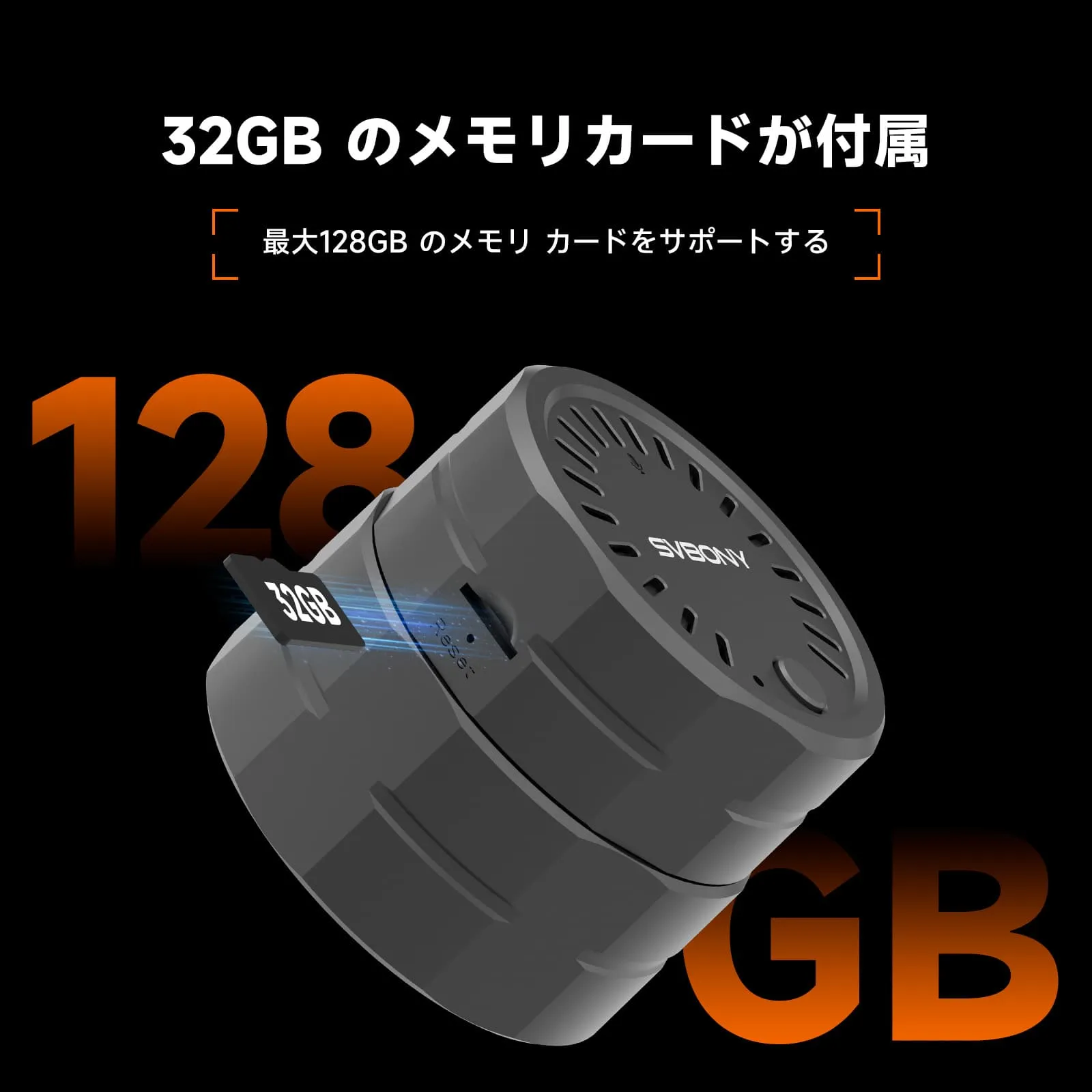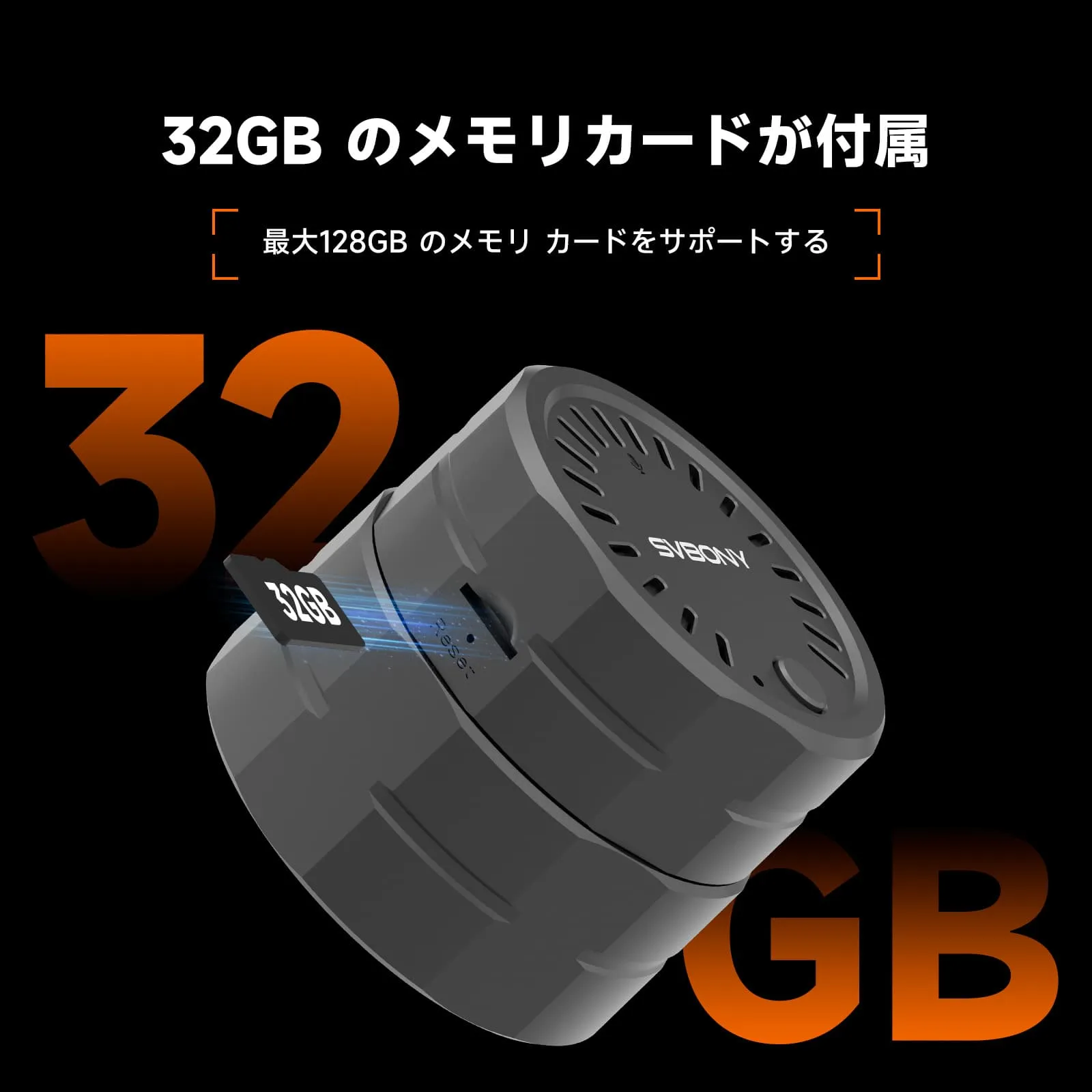 SC002 には、32GB TF カードが搭載されています。写真やビデオなどの素材をスマホのストレージを占有することなく TF カードに保存できます。さらに、1500mAhのリチウム電池を内蔵しており、連続2時間以上、断続3.5時間の動作が可能です。