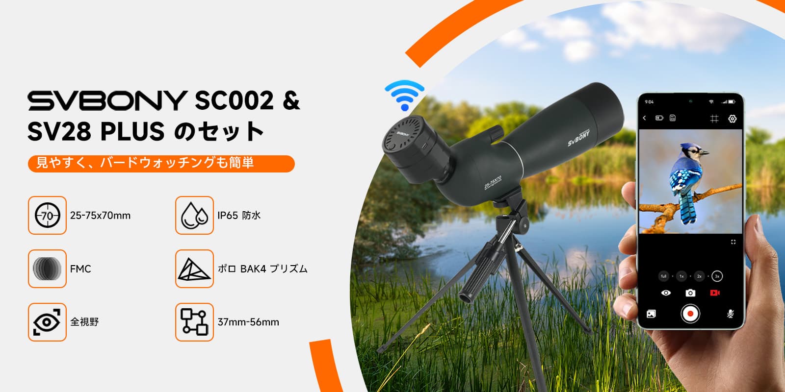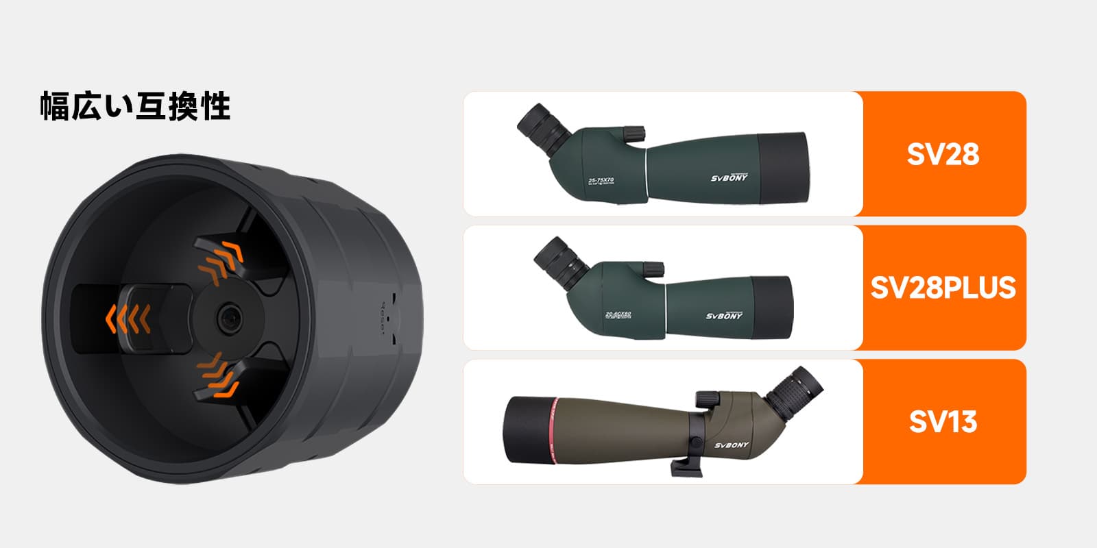 SVBONY SC002 Wi-Fi カメラは、外径 37mm から 56mm の接眼レンズに対応しており、強いグリップ力と安定した接続を確保して、細部まで驚くほど鮮明に撮影できます。アウトドア アドベンチャーに最適なパートナーです。