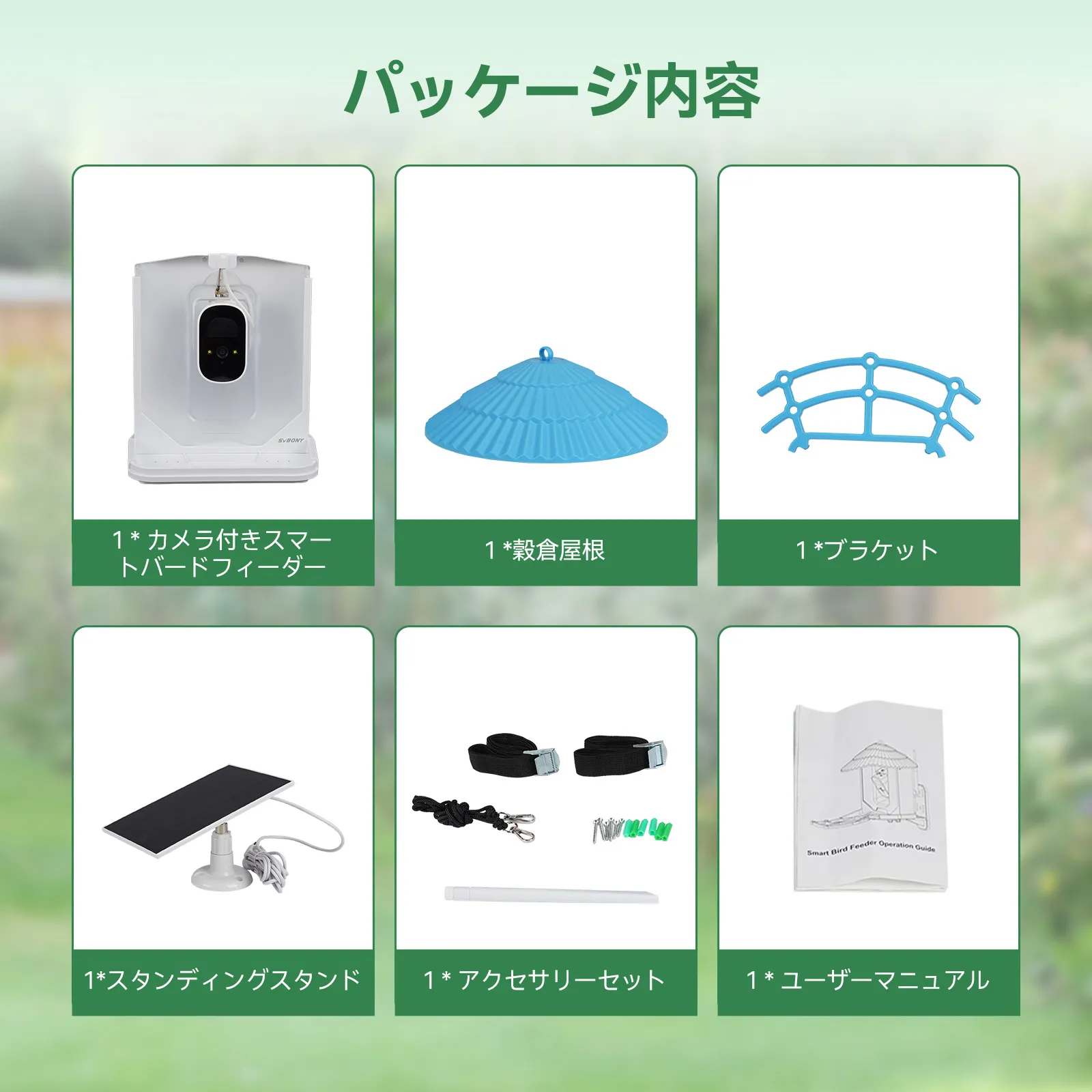 スマートバードフィーダーには、穀物屋根、ブラケット、スタンド、アクセサリーセット、ユーザーマニュアルが含まれています。