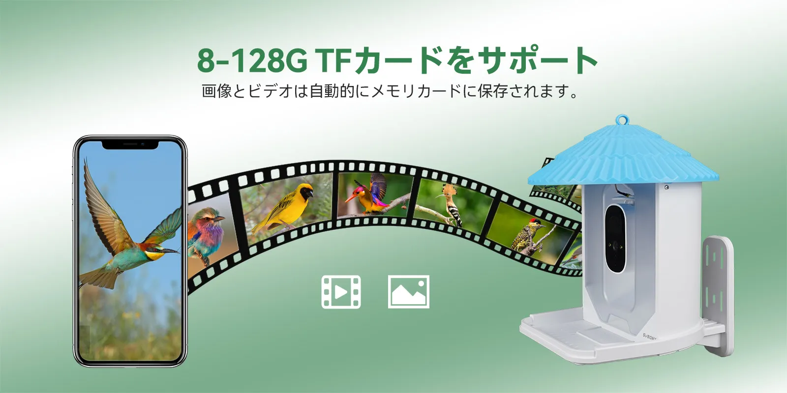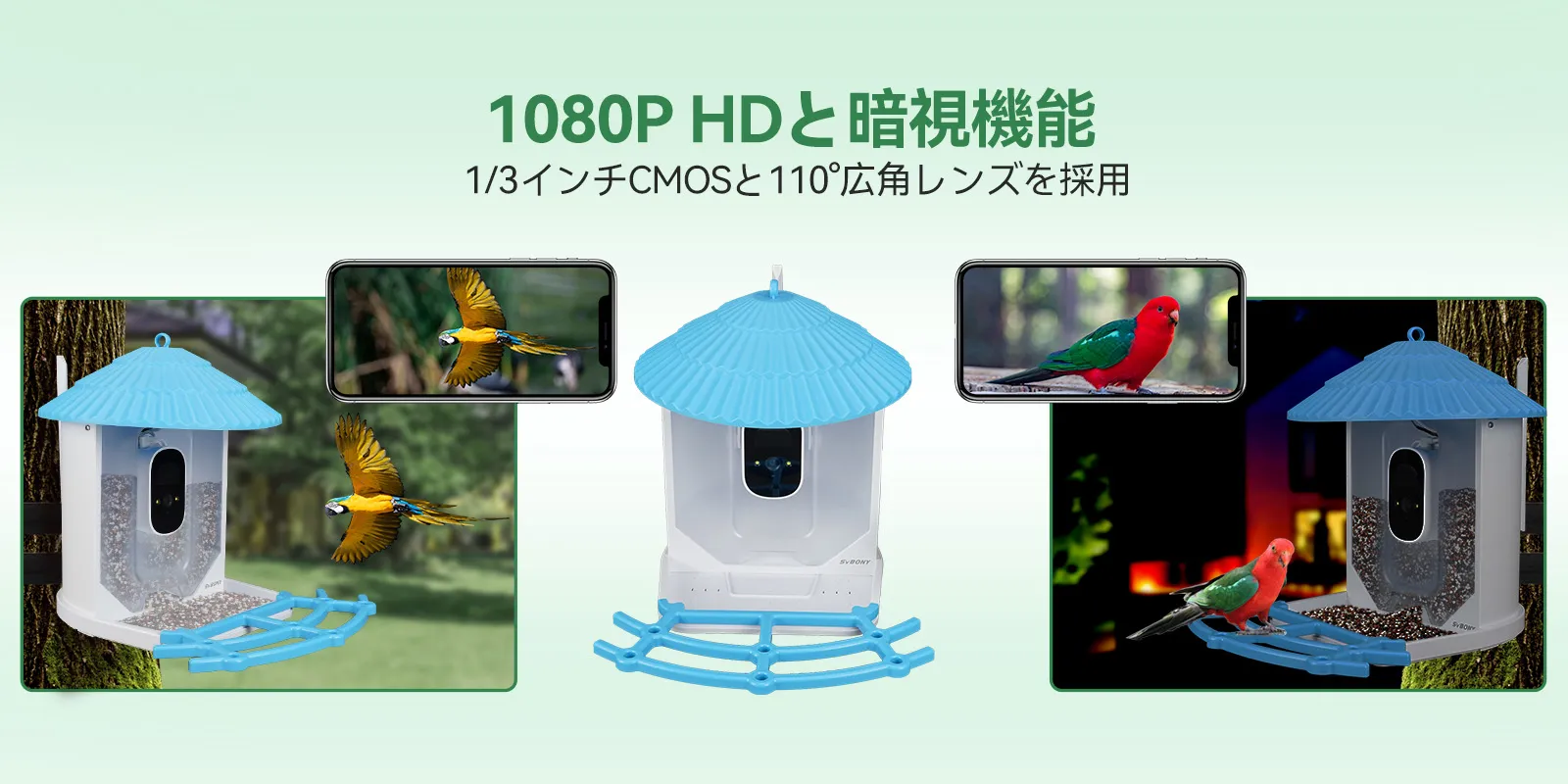 バードフィーダーは4メガピクセルの高解像度写真と1080Pの高解像度ビデオを撮影できます。暗い場所でも高解像度のカラー画像を撮影できます。