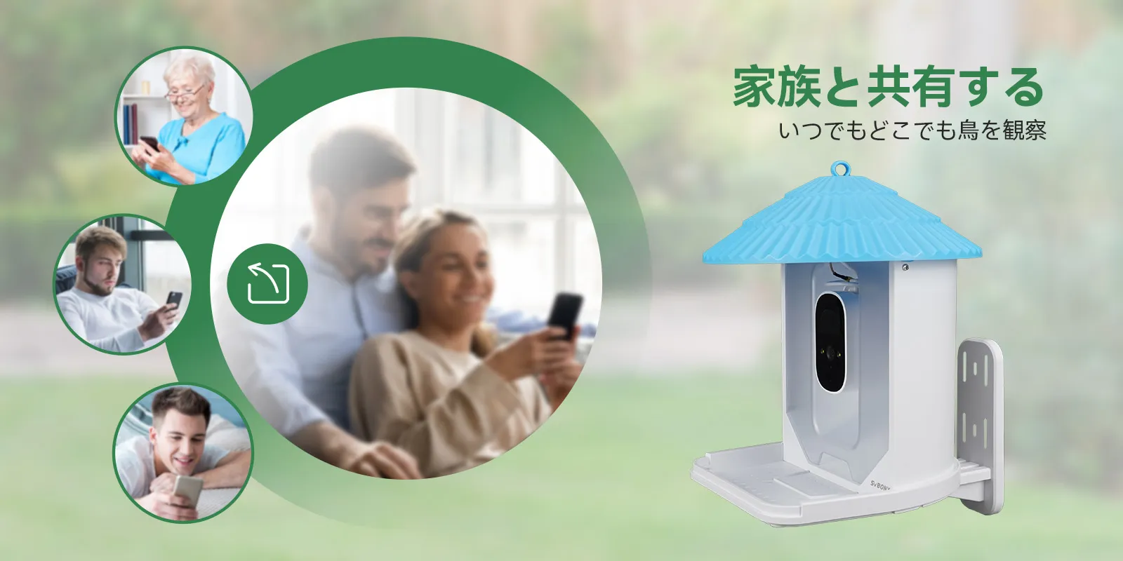 スマートバードフィーダーを家族や友人と共有できます。リアルタイムで着信通知を受信し、鳥の餌箱で検出された鳥を確認します。