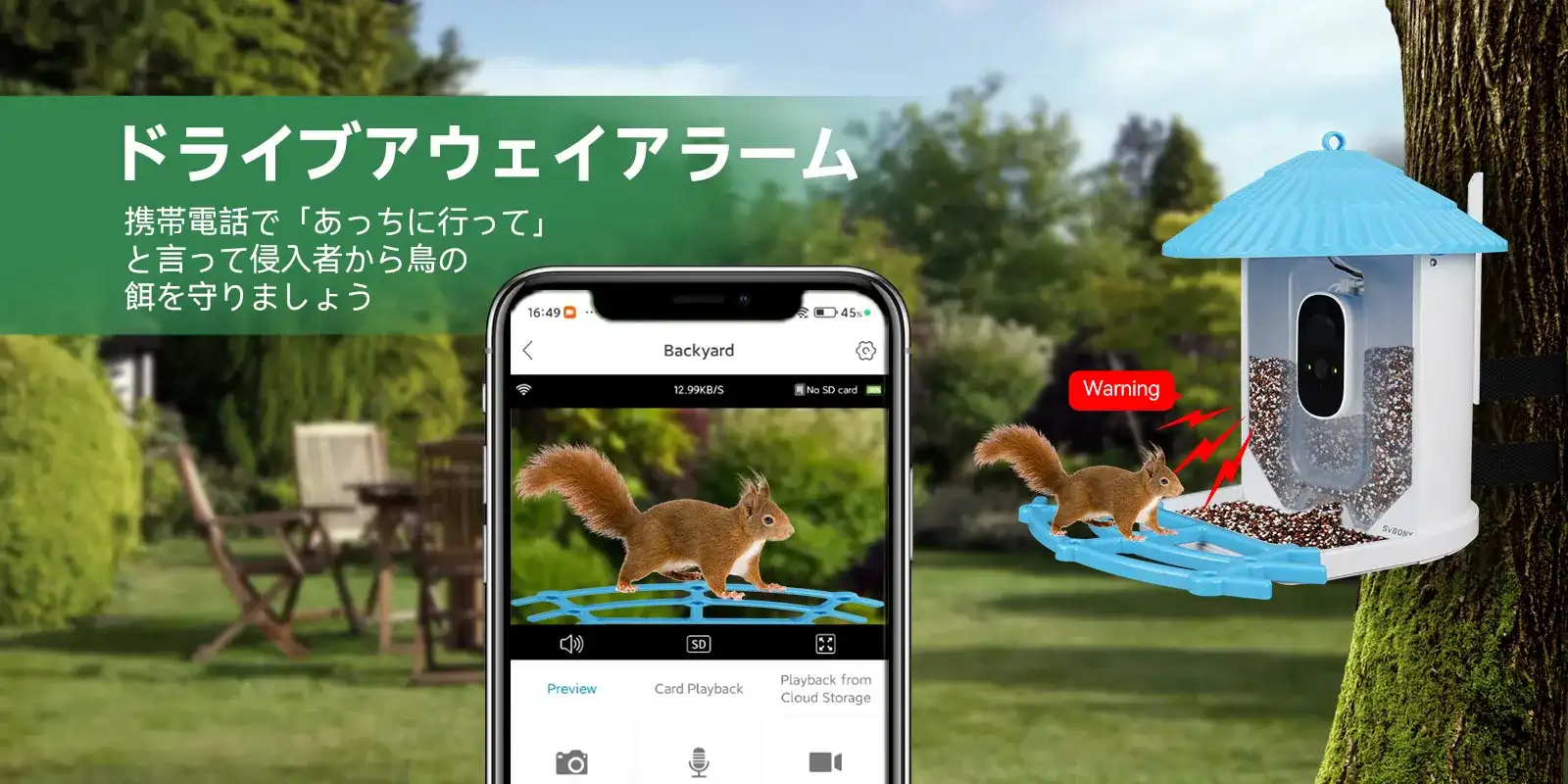 鳥やリスが鳥の餌箱に近づいているかどうかをリアルタイムで確認できます。 マイクで「あっち行って」と言ってリスを追い払います。