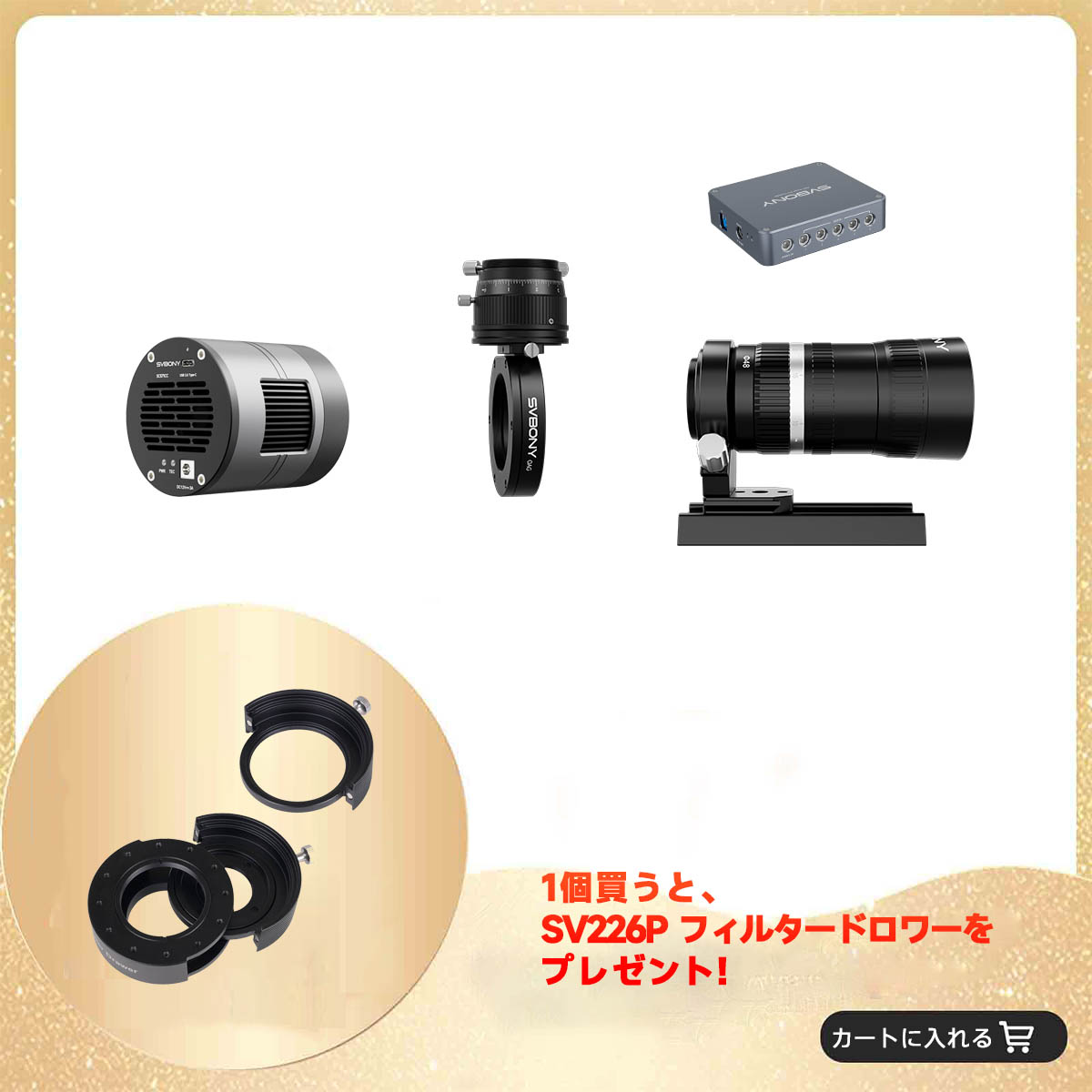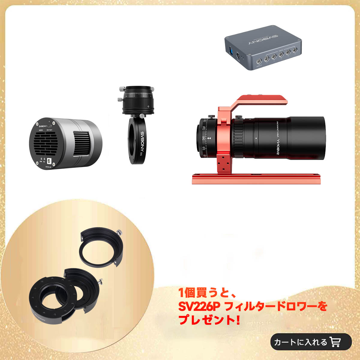 ご自身の撮影ニーズに合わせて、SV535/SV545/SV555の3種類の鏡筒からお選びいただけます。セットにはSV238 OAG オフアキシスガイダー、SV226Pフィルタードロワー、天文用電源制御ボックスも含まれており、プロ仕様の撮影に必要なアイテムが一式揃った、大変お得な高コスパセットです。