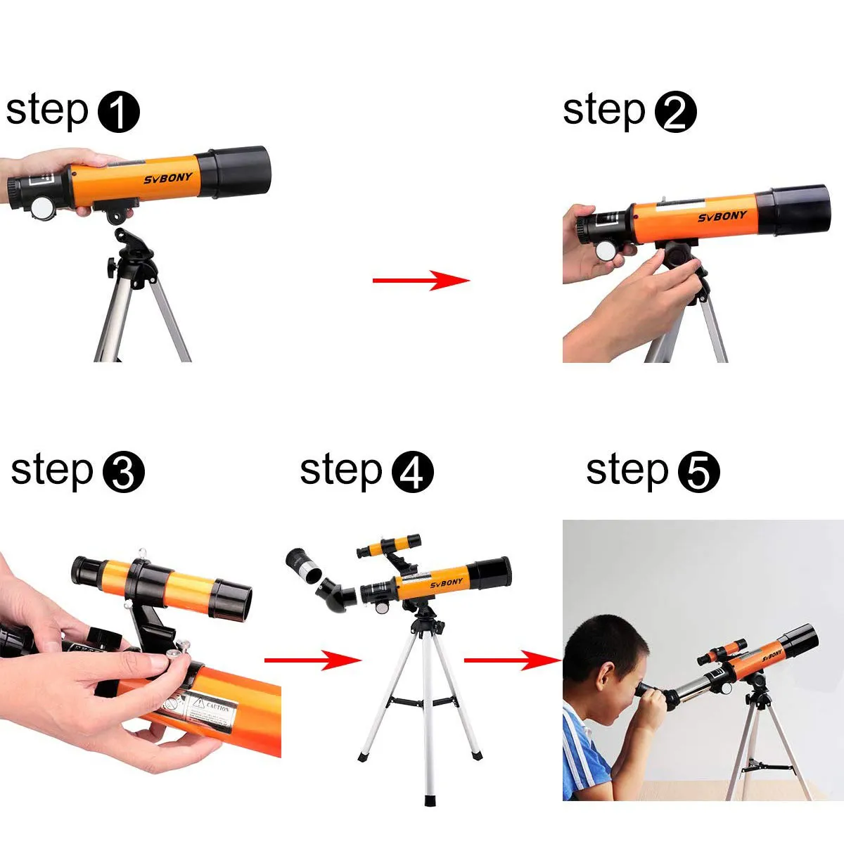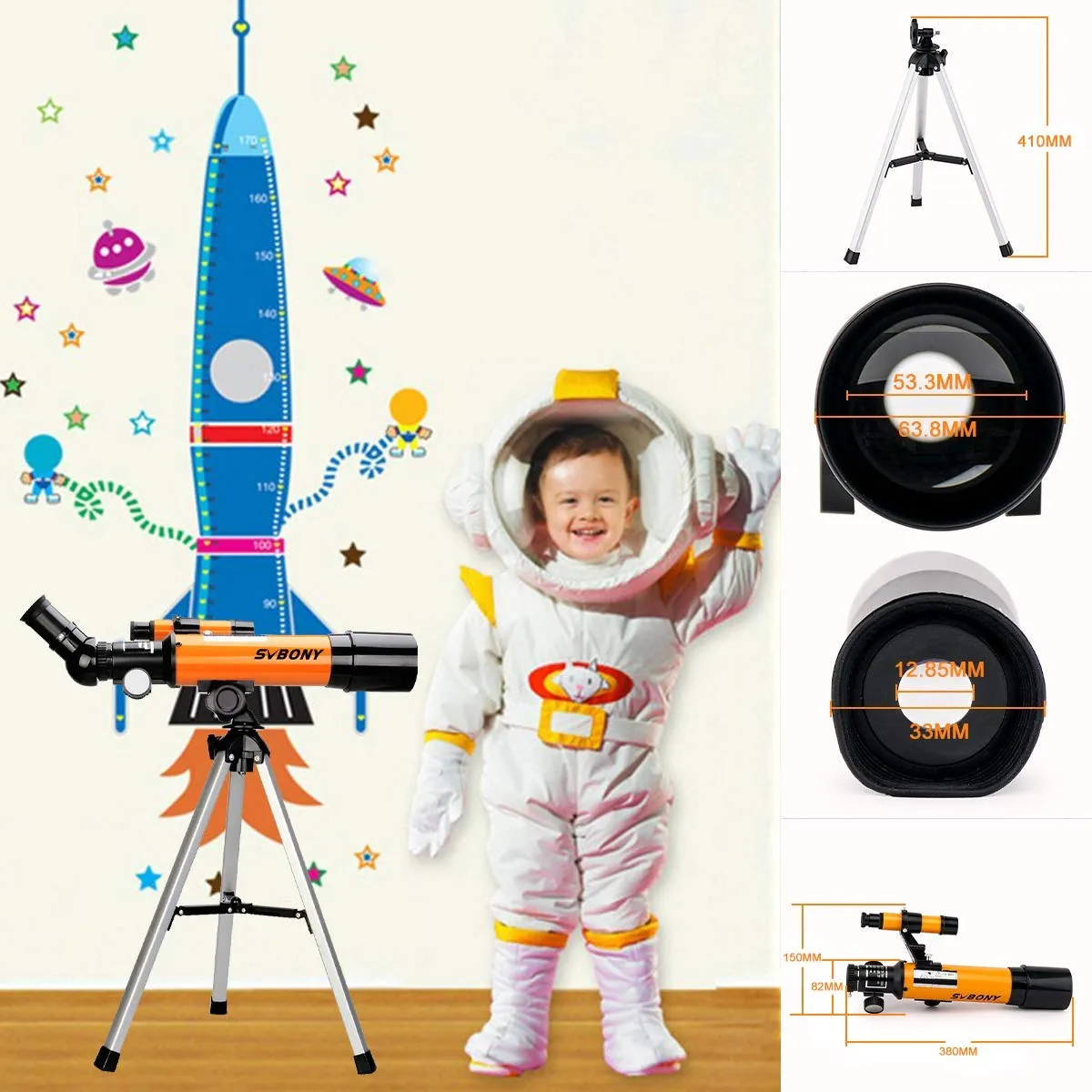 | 子供向けに設計された調整可能な三脚16.14インチの三脚の高さは、子供の身長に最適です。これは、子供が簡単に空と月を観察し、子供の想像力と創造力を刺激することを可能にします。360度水平調整及び90度垂直調整で雲台を調節できます;望遠鏡の向きを簡単に変更し、360度のスムーズなパンニングはフルパノラマショットに最適です。 | 簡単に調整可能なビッグフォーカスホイールSV502フォーカルホイールはゴム製で、触るのが快適で、子供に害を与えません。 | 50MM高品質のフルコーティング光学レンズFMCコーティングプロセスは基本的な光学イメージング要件を確保して、市販の一部のコーティングされていない白いガラスとは異なります。 |