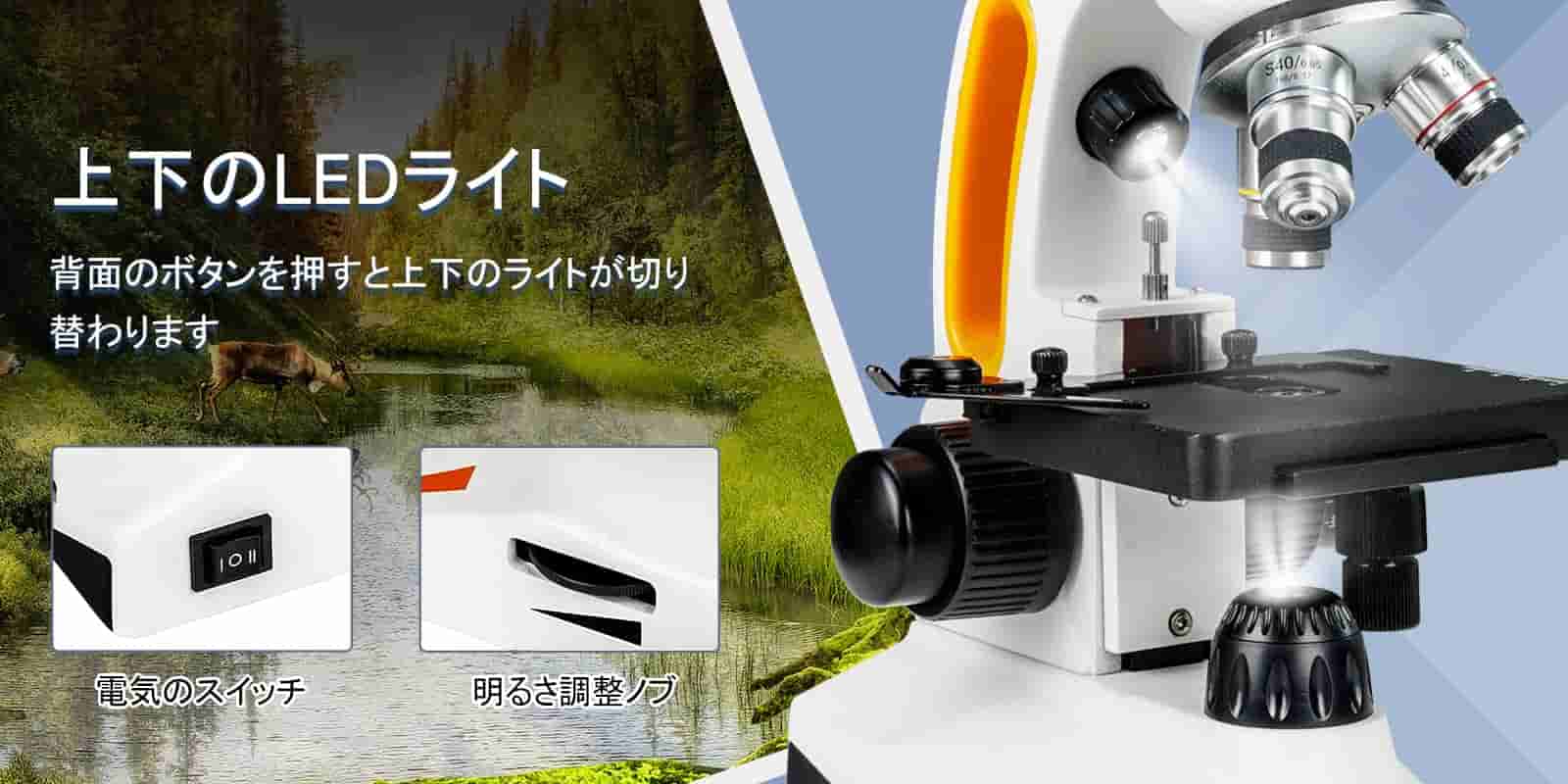 単眼顕微鏡は上下の LED ライトにより、上から照らされた不透明な対象物を観察できます。 また、半透明の標本を下から照らして観察することもできます。 調光スイッチを使用して光の強さを変更できます。