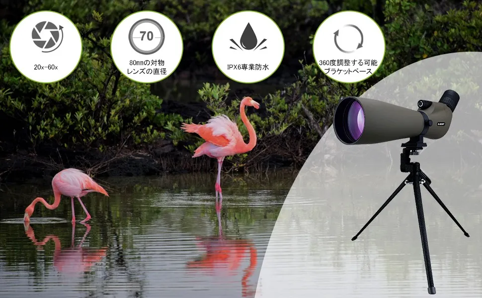 2. 7枚5群接眼レンズ;BK7プリズム;対物レンズは80mm大口径で明るく視野も広い、観馬場、アーチェリーではなかなか観光効果があります。80mm大口径は驚いた集光力があって、裸眼で見る明さを感じさせて、視力が悪い方も快適に観察できます。