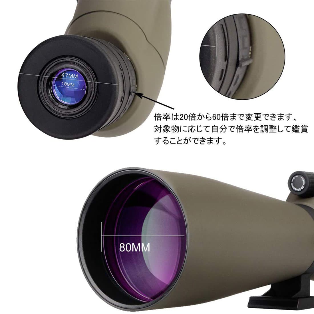 初めてフィールドスコープを購入しましたが、この機器はいい意味で期待を裏切りました。 この機器の価格・仕様からそれなりのものだろうと期待はしておりませんでした。 商品紹介にはプリズムの材質がBK7と記載されているかと思えば、商品の写真にはBaK4と記載されていたりと、信頼度が低かった。 購入を決めたのも、割引があったからと、怖いもの見たさがあったからです。 が、実際のぞいてみると、見え味は価格に見合ったレベル以上のものでした。20〜40倍では文句なし。 夜間、試しに木星をのぞいてみたら、縞模様まで見えてしまいました(60倍で)。びっくりしました。 (ちなみに、天体望遠鏡は通常セレストロンC8を使用しております)