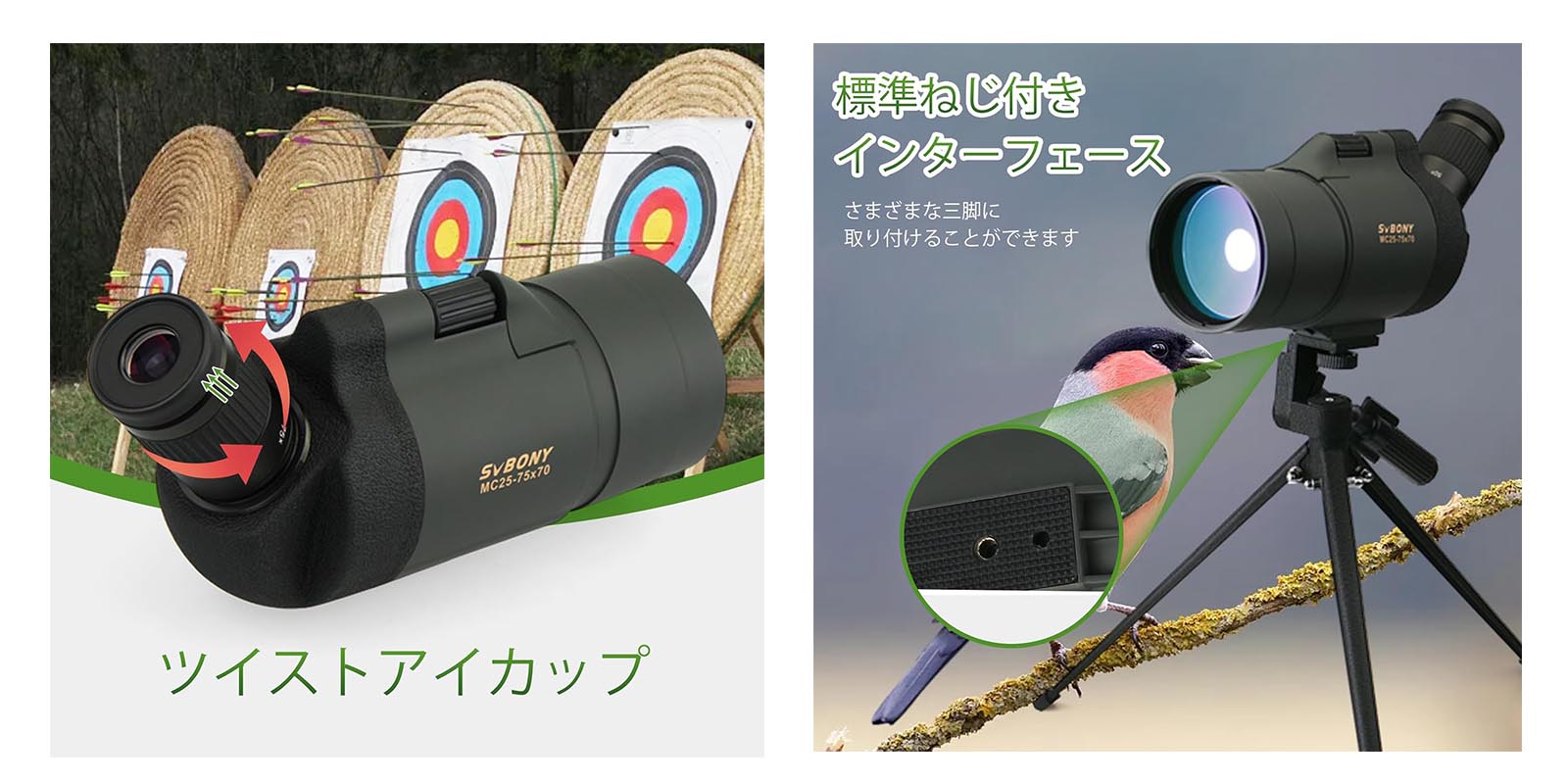 - 45度の角度の接眼レンズはより快適な視聴を提供します。バードウォッチング、天体観察、アーチェリー、自然観察などを適用します。