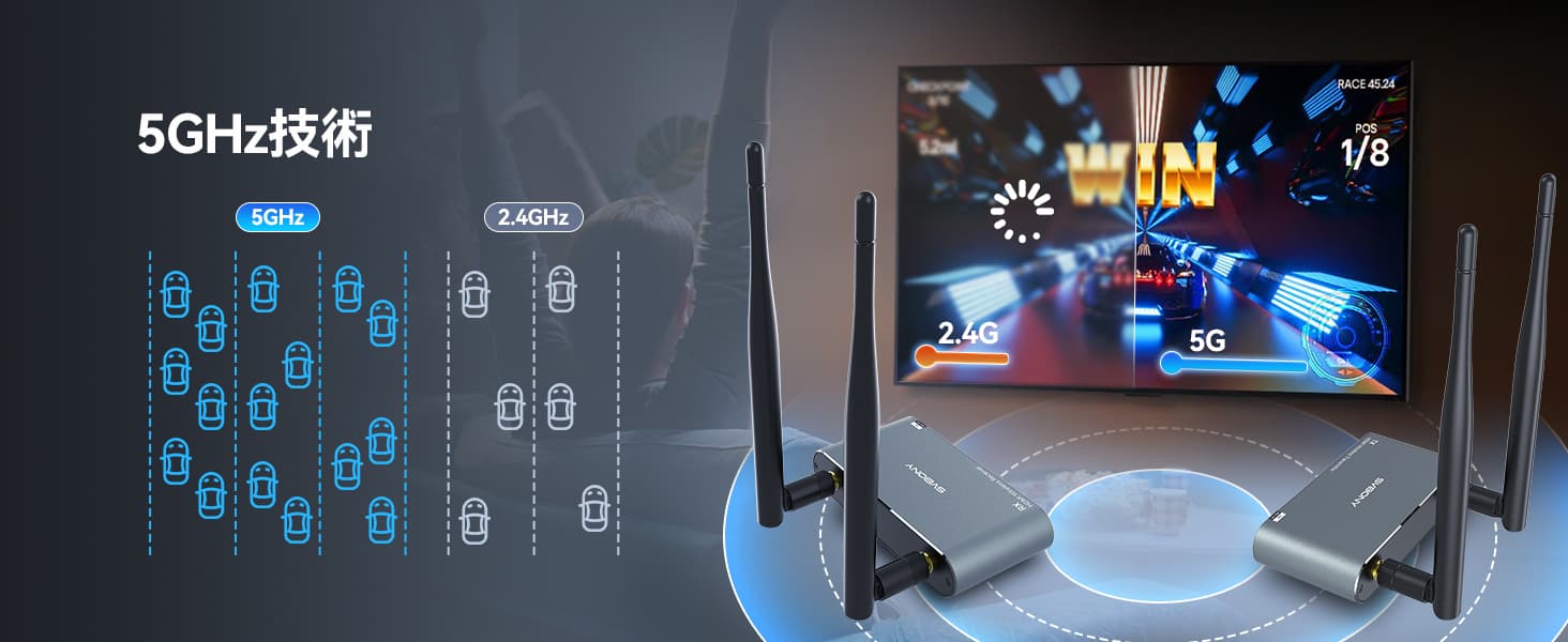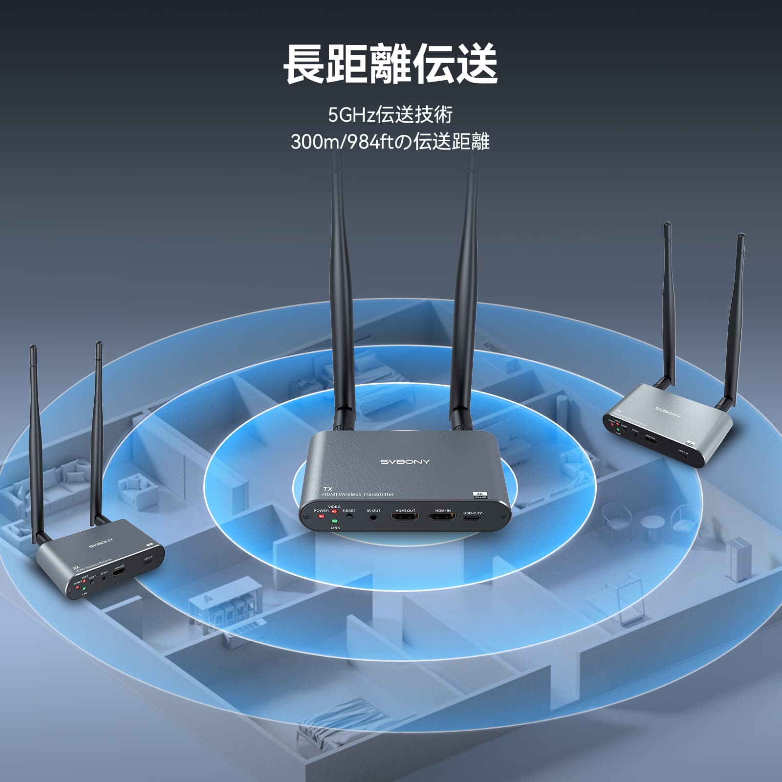 5GHz 標準伝送技術と 300m/984ftのオープン動作範囲により、さまざまな場所でもスムーズで安定した接続が保証されます。1台の映像信号(および音声)を最大4台のモニタに同時出力し、増幅機能搭載により長距離延長が可能です。