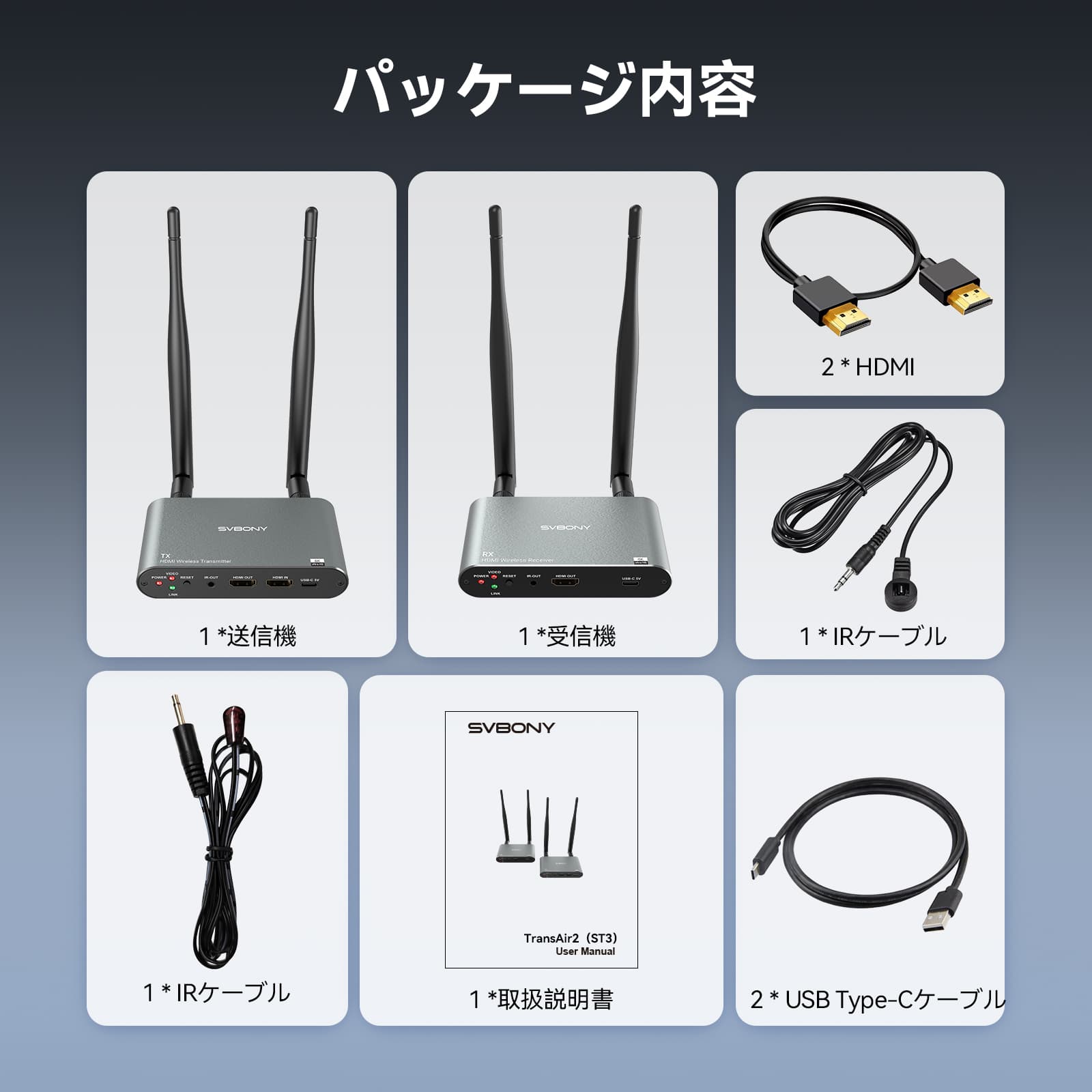 TransAir2 (ST3)ワイヤレスビデオ伝送システム ワイヤレス映像伝送システム 送信機*1+受信機*1 ≤0.06秒低遅延 300Mの伝送距離 同時に4セット使用可能 ホームシアター/ビジネス会議等に適用