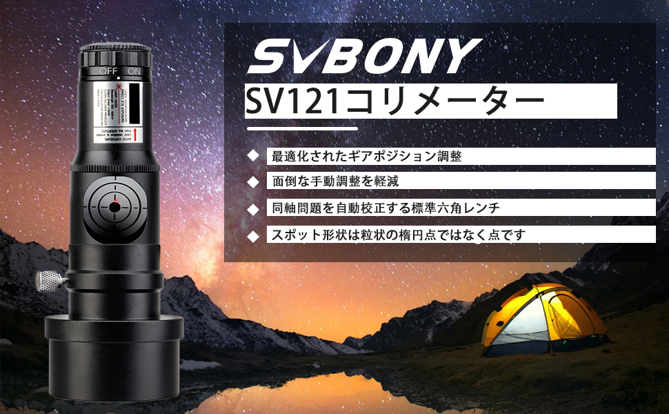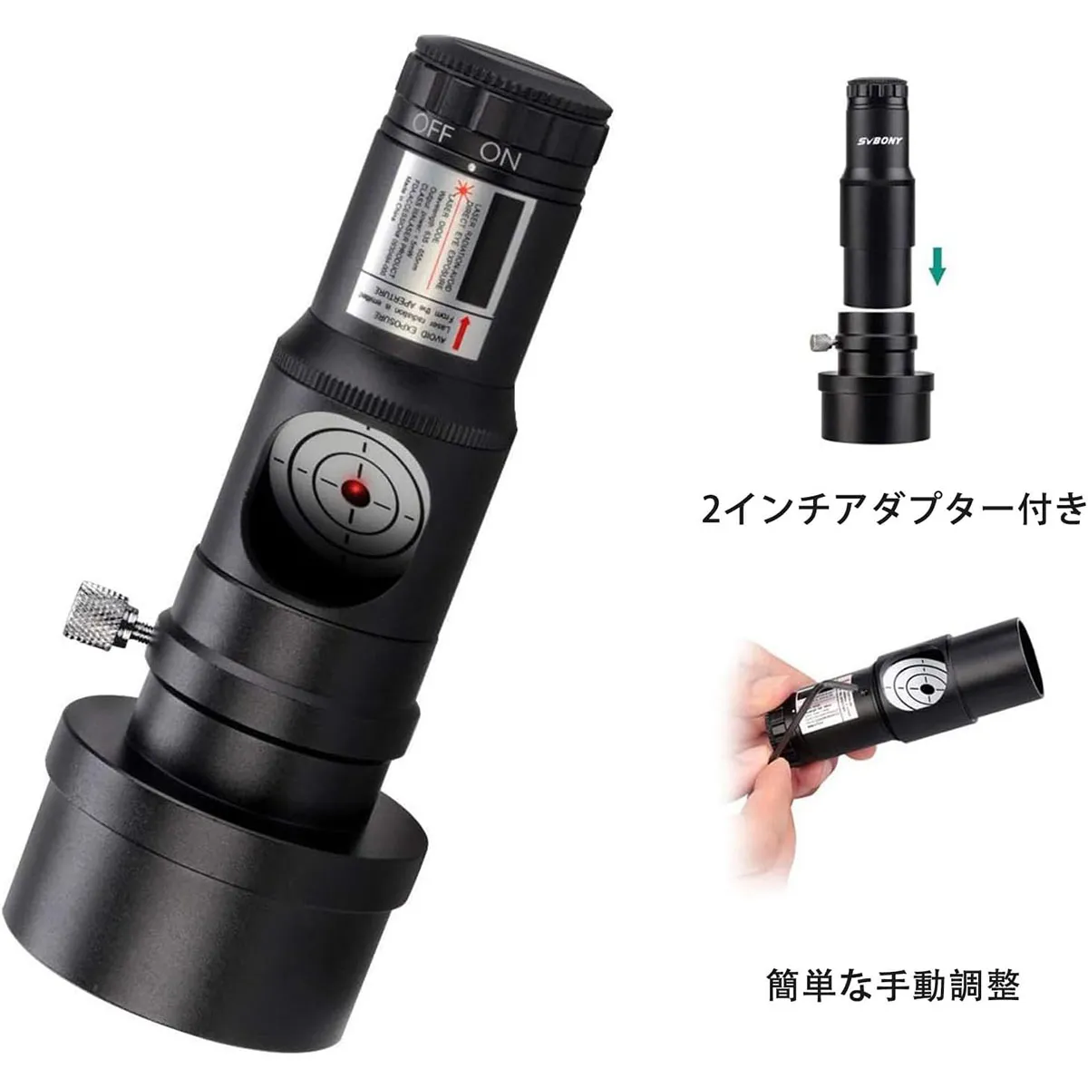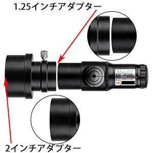 1.25 インチのバレルサイズ、2 インチのアダプター付き1.25 インチおよび 2 インチのフォーカサーに適合します。 SV121 コリメータは取り外し可能な 2 インチアダプター付きで、どちらも標準直径 1.25 インチと 2 インチ直径に適合します。 |