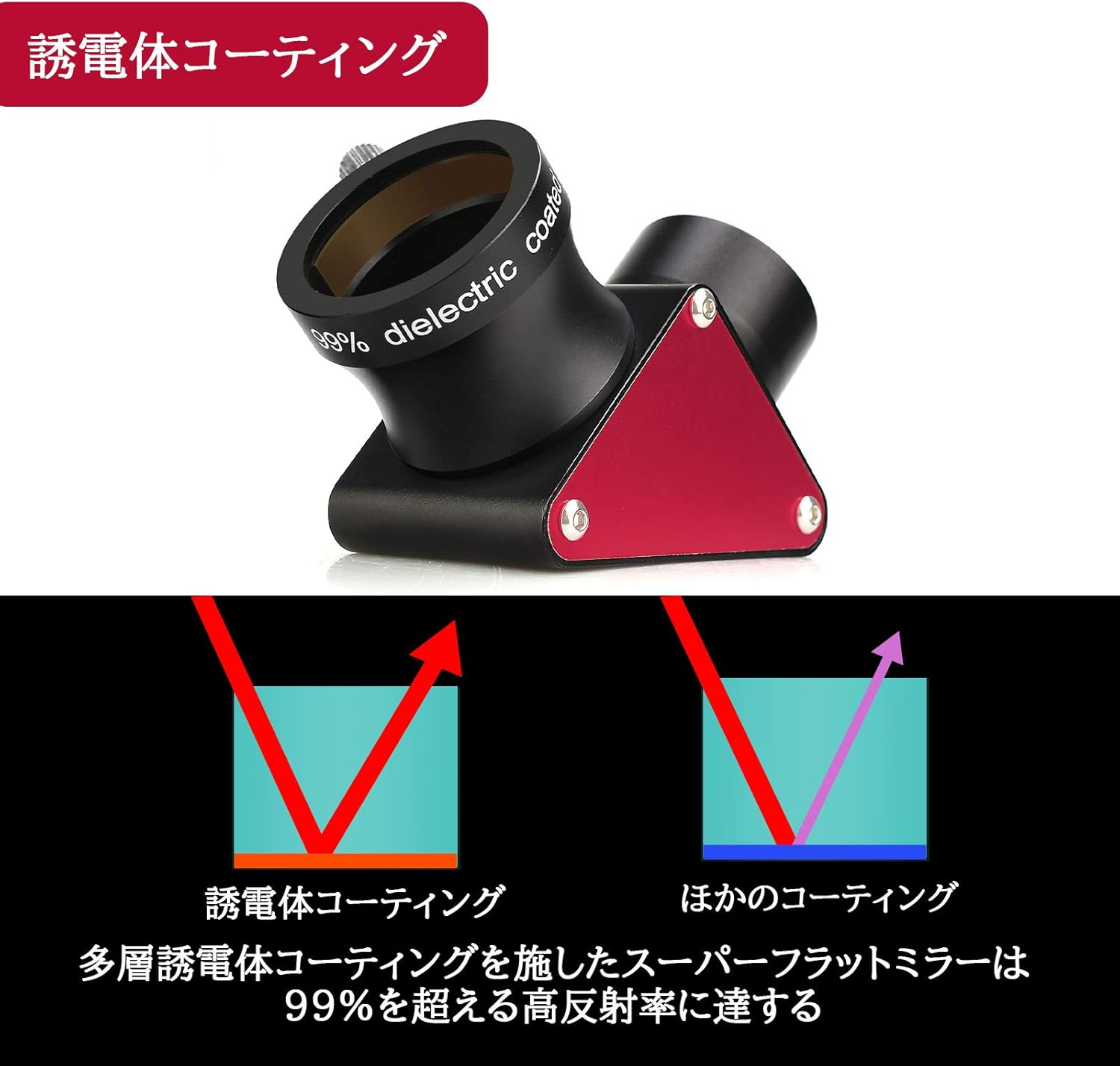 心臓部には99%反射率超高精度ミラーを搭載し、視野周辺まで良好な上下正立像を得ることができるように設計しています。特に90度なので、天体用で楽な姿勢で観望できます。