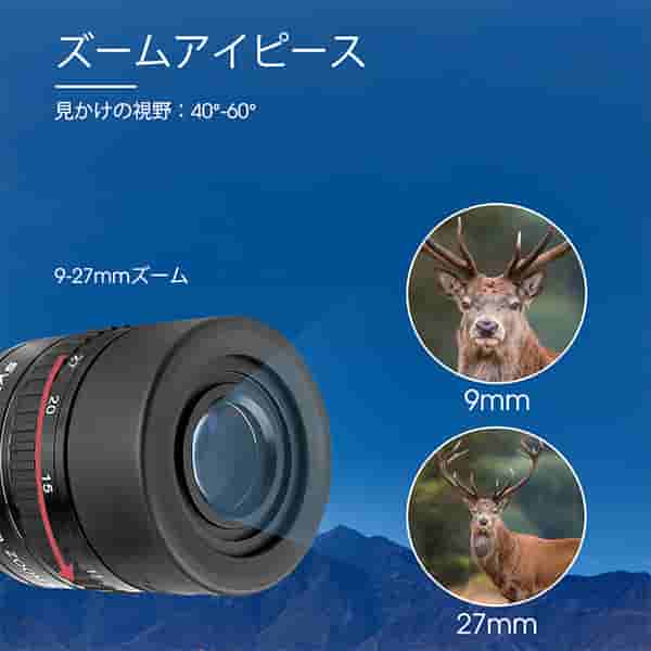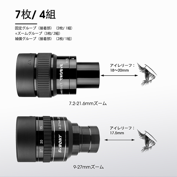 1.SV191超広角1.25 インチ7.2mm-21.6mm(9-27mm)ズームアイピースは高屈折ガラスを採用しており、接眼レンズを変えずに倍率を変えることが可能です。