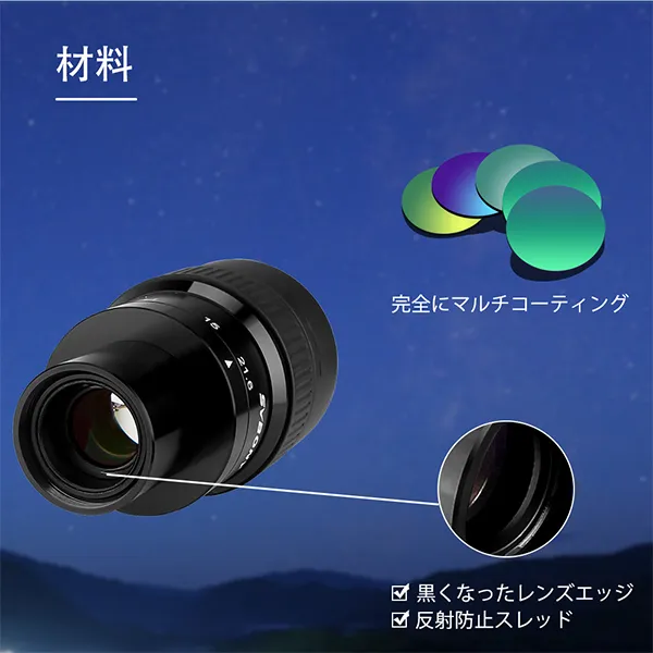 レンズは7枚/4組のマルチコーティングされた高屈折率ガラスで、シャープでハイコントラストの観測が可能です。