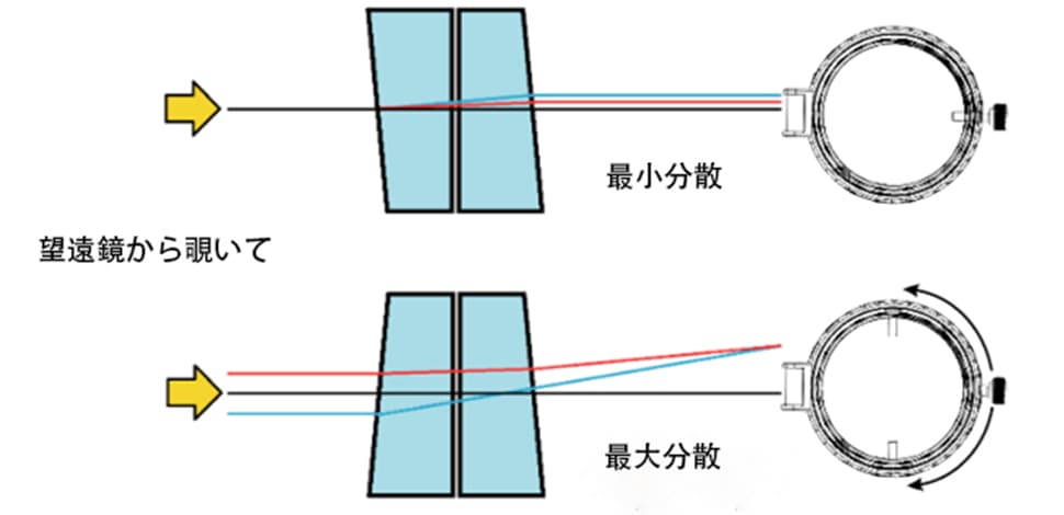 ADCには2つのウェッジプリズムが組み込まれており、これらは互いに平行に配置され、横方向に回転します。各プリズムのくさびは、一定量の分散(負)を導入し、既存のオブジェクトの色分散を補正します。天頂に近い対象天体は分散が少なくなります。地平線に近い対象天体は、より顕著な色分散を持っています。そのため、ADCによって大気分散を補正する必要があります。プリズムを回転させて、必要な補正を行います。そうすることにより、異なる光の波長のいくつかの対象画像がシフトされ、それらを単一の画像に戻し、鮮明な画像を作成します。専用のソフトウェアでさえ、異なるRGBチャネルを正しく位置合わせできず、この補正を完全に実行できるのはADCだけです。