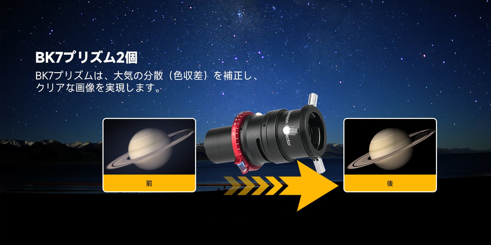 BK7プリズムが画像品質を向上。大気分散補正プリズムのBK7プリズムは優れた分散特性を示し、画像のぼやけや色の歪みを補正し、遠方の天体の画像品質を大幅に向上させます。