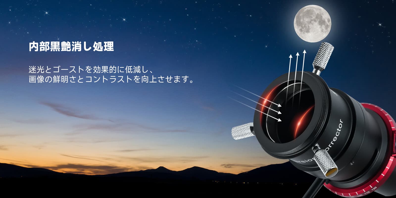 画像の鮮明さとコントラストを高めます。大気分散補正プリズムの内部の内部黒艶消し処理により、迷光とゴースト効果が大幅に低減され、表面での光の反射と散乱が効果的に最小限に抑えられます。