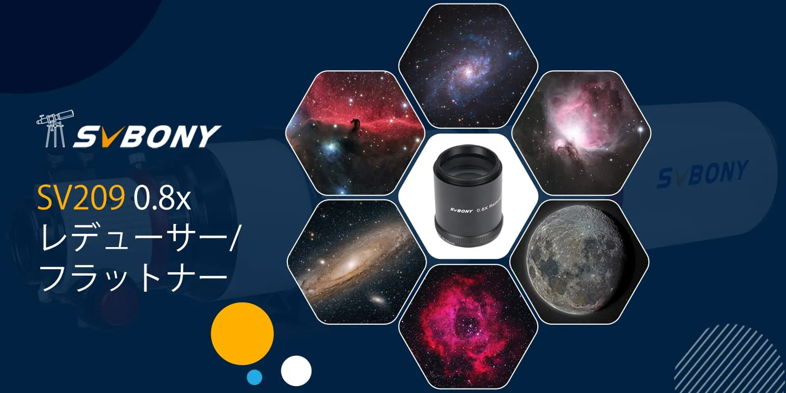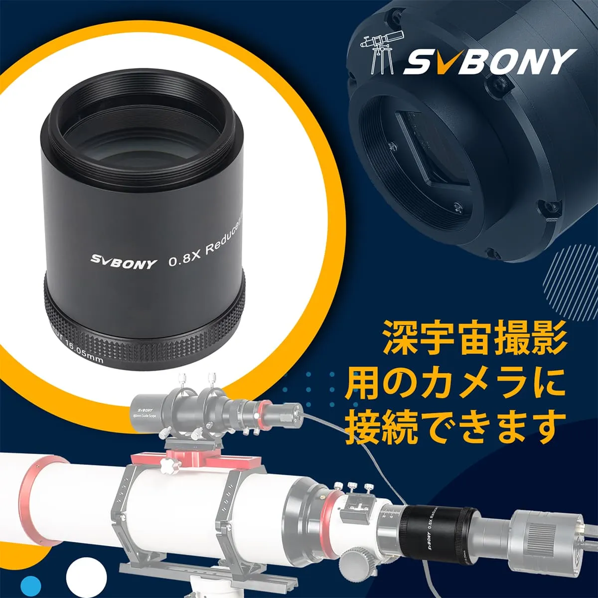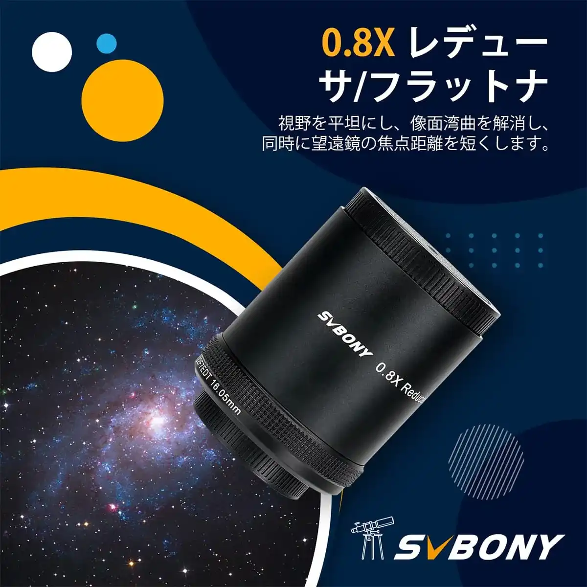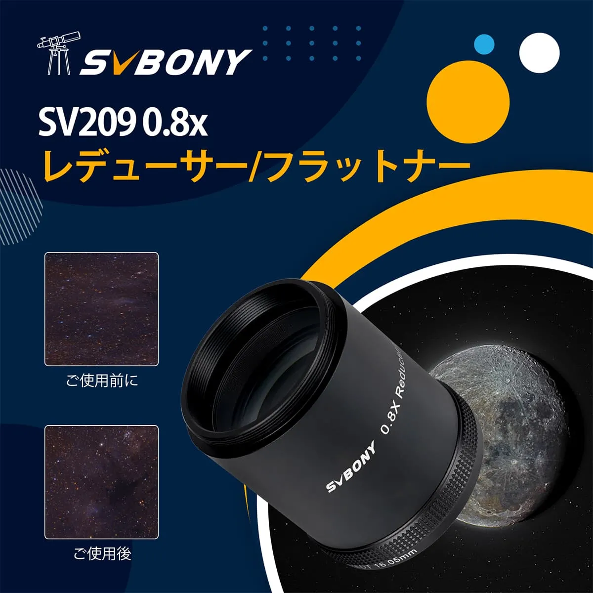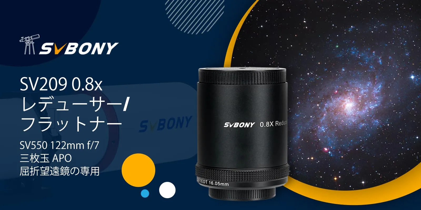 1.SV209 2インチ 0.8Xレデューサー/フラットナー は、SV550 122mm APO専用に設計、製造されています。また、フラットナーとレデューサーとしての2つの機能を備えています。