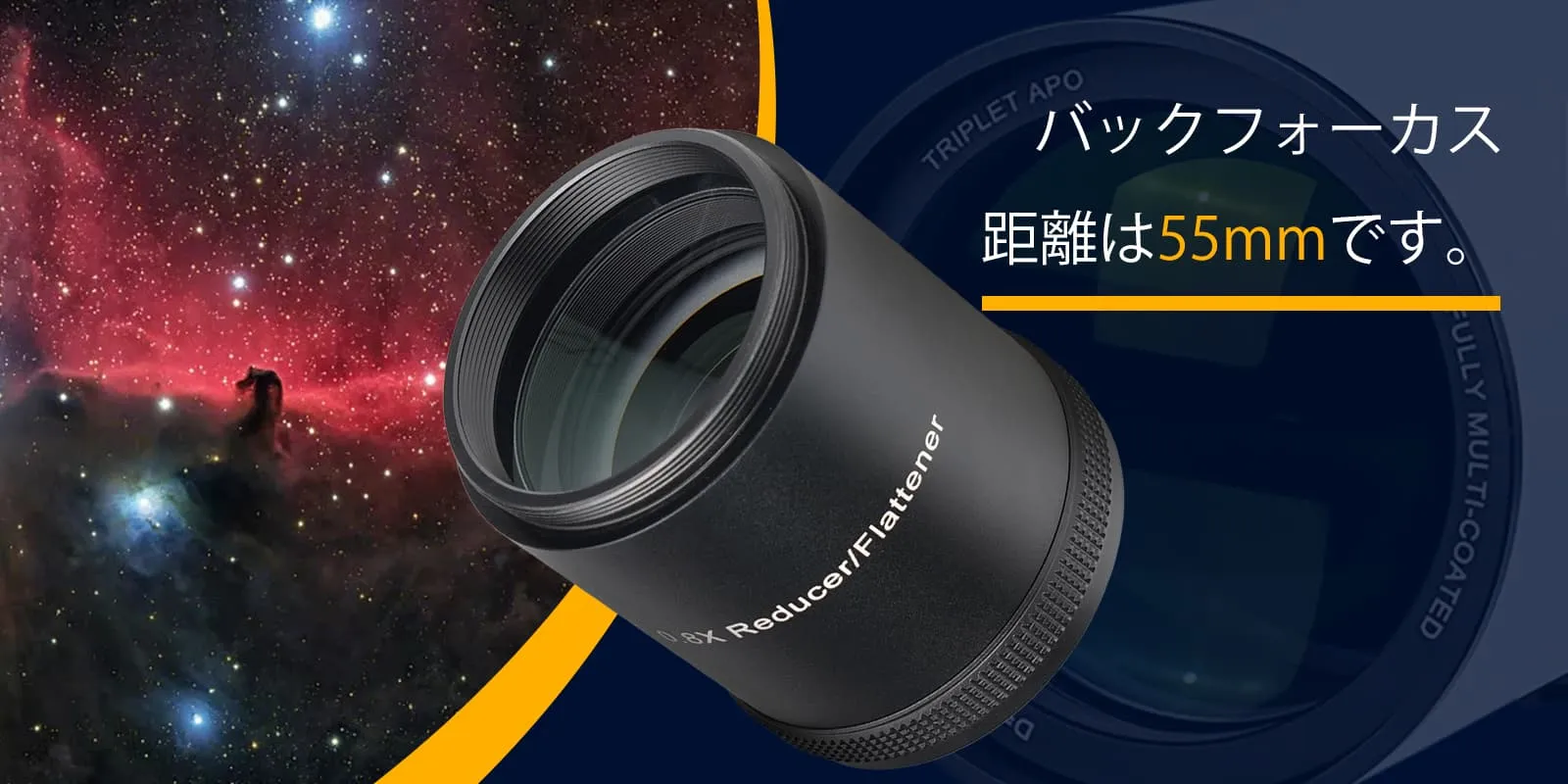 レデューサーの機能として焦点距離を短くし、F値を明るくすることで天体撮影の構図に広がりができ、より短時間の露光で美しい天体写真を撮影することができます。
