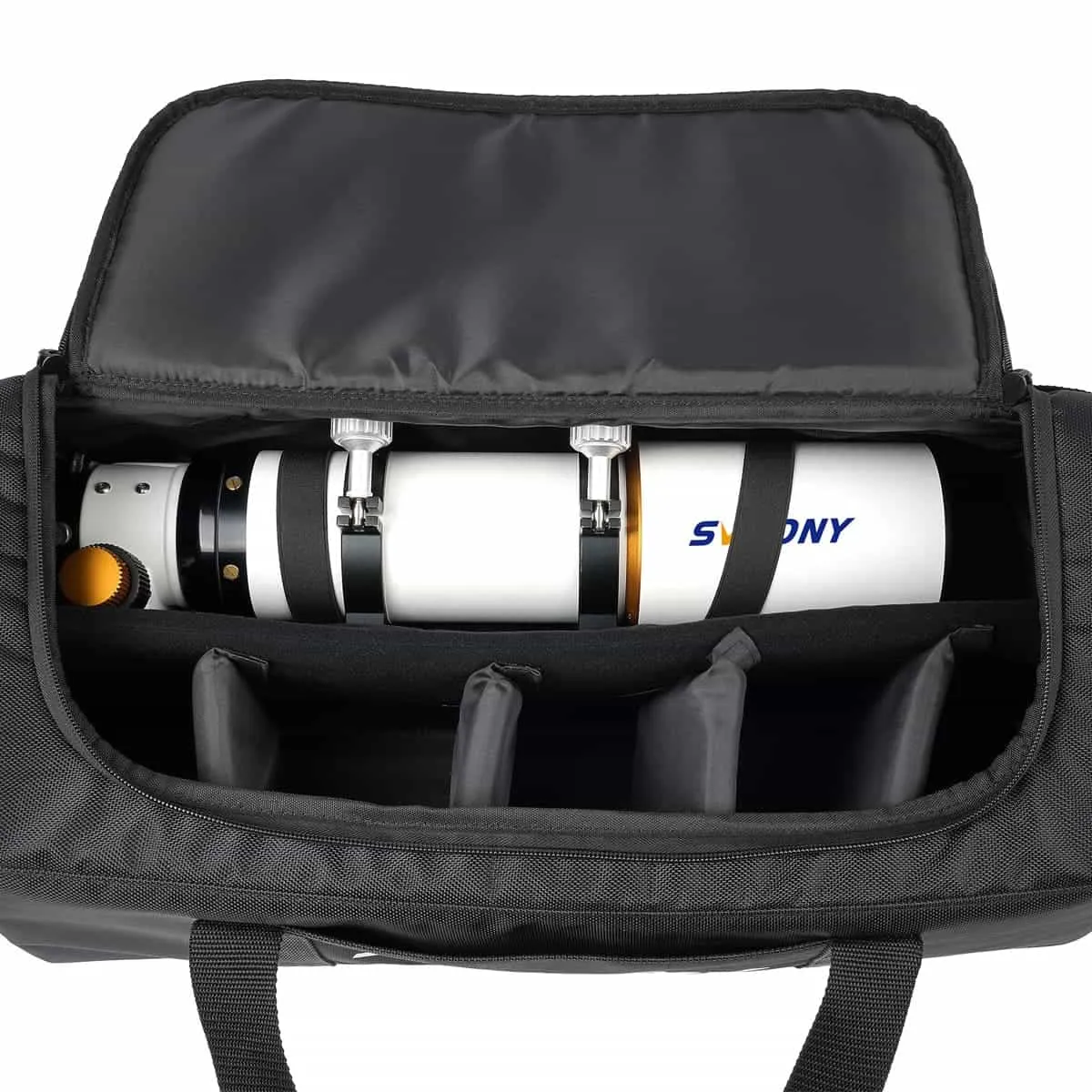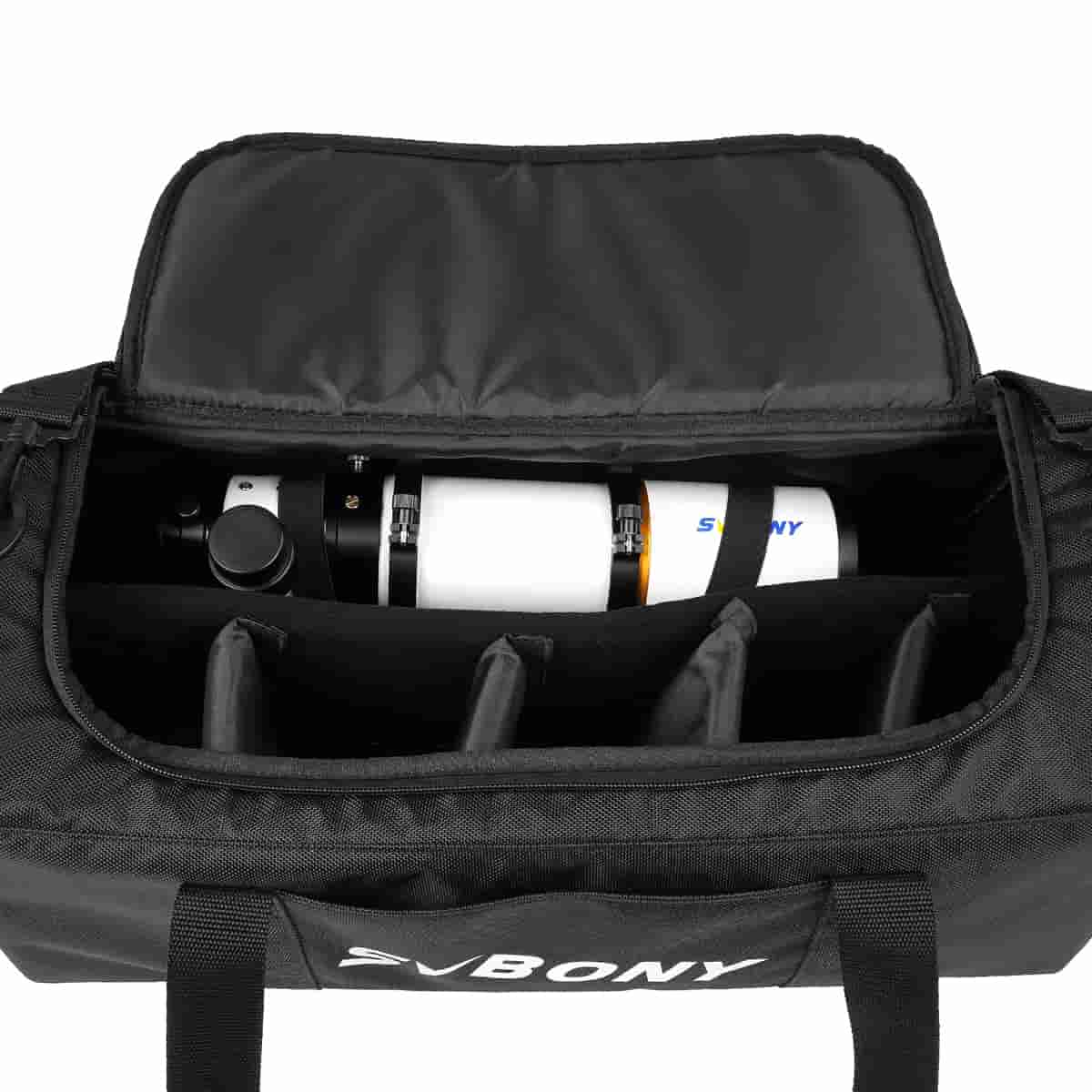 SV212キャリングバッグには、望遠鏡の付属品を収容し、アイテム間の摩擦によって引き起こされる損傷を回避するために、4つの取り外し可能な内部パッド付き仕切りがあります。