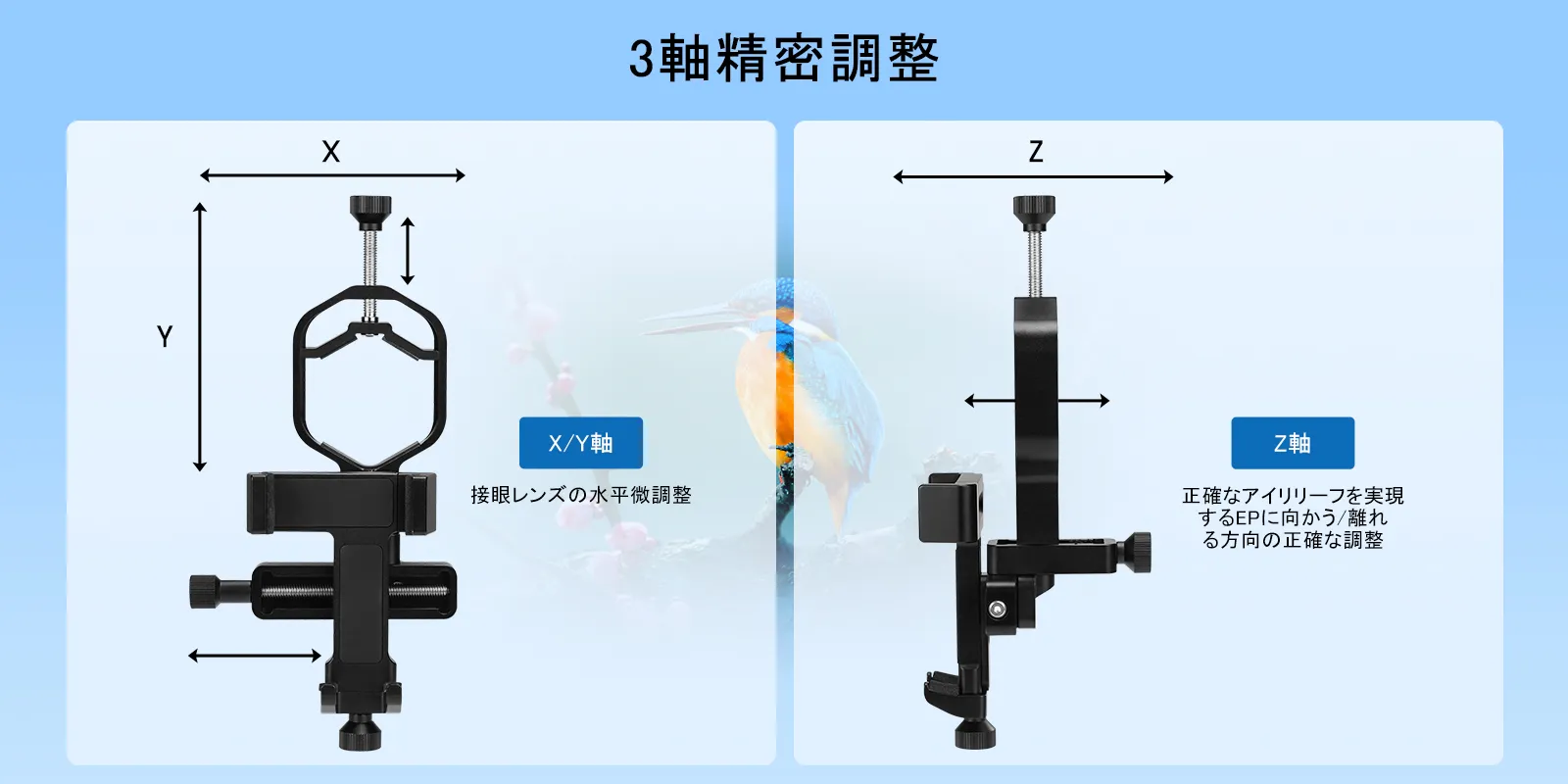 上下・左右・前後のあらゆる方向で高精度な調整が可能。スマートフォンのカメラを接眼レンズの中心に正確に配置します。