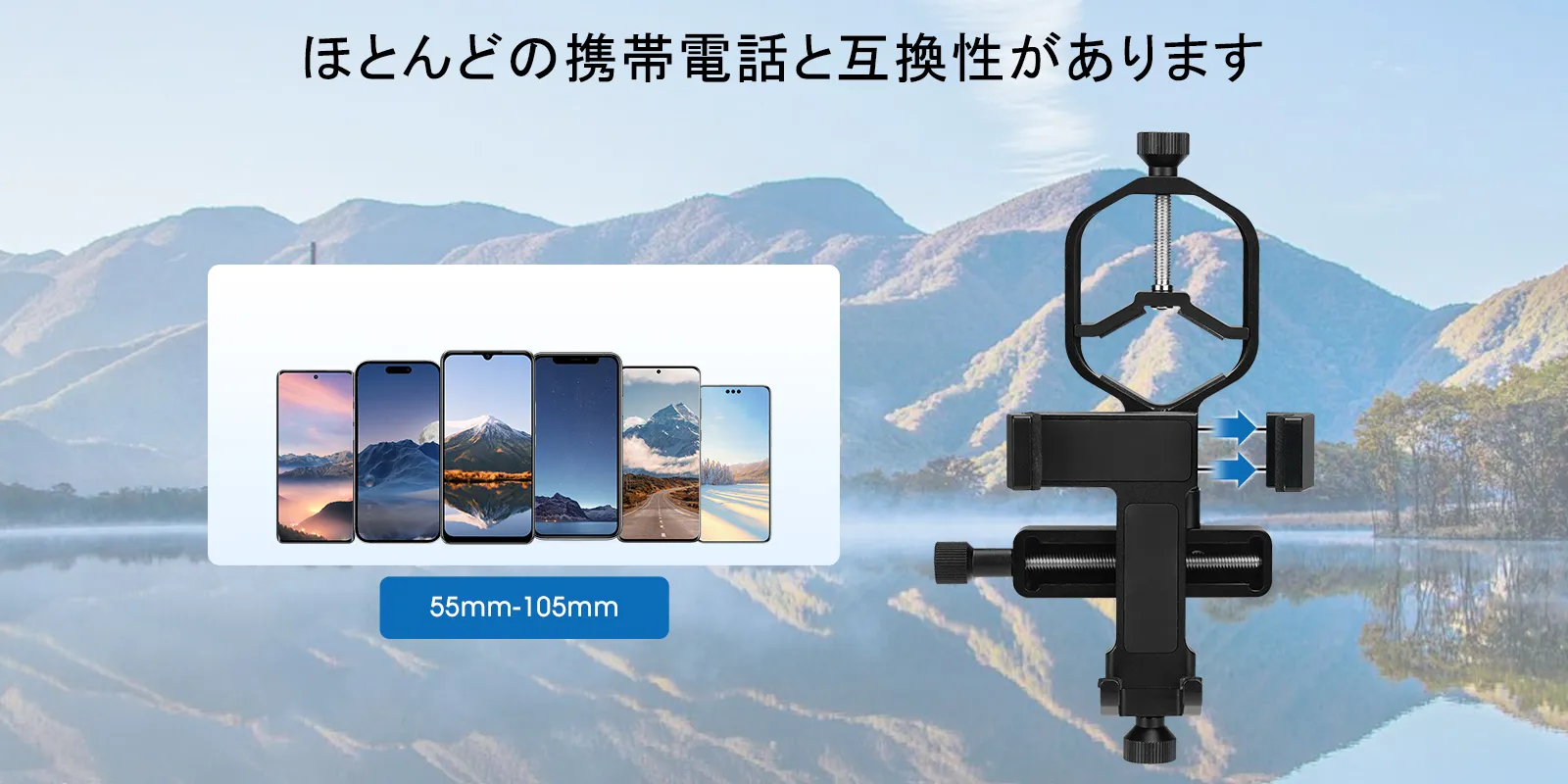 W9176A:幅55mm~105mmのほとんどのiPhone/Androidスマートフォン、および接眼部外径28mm~48mmの望遠鏡や双眼鏡など、多様な機器に対応しています。